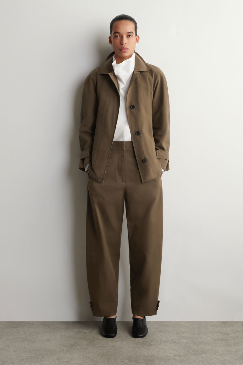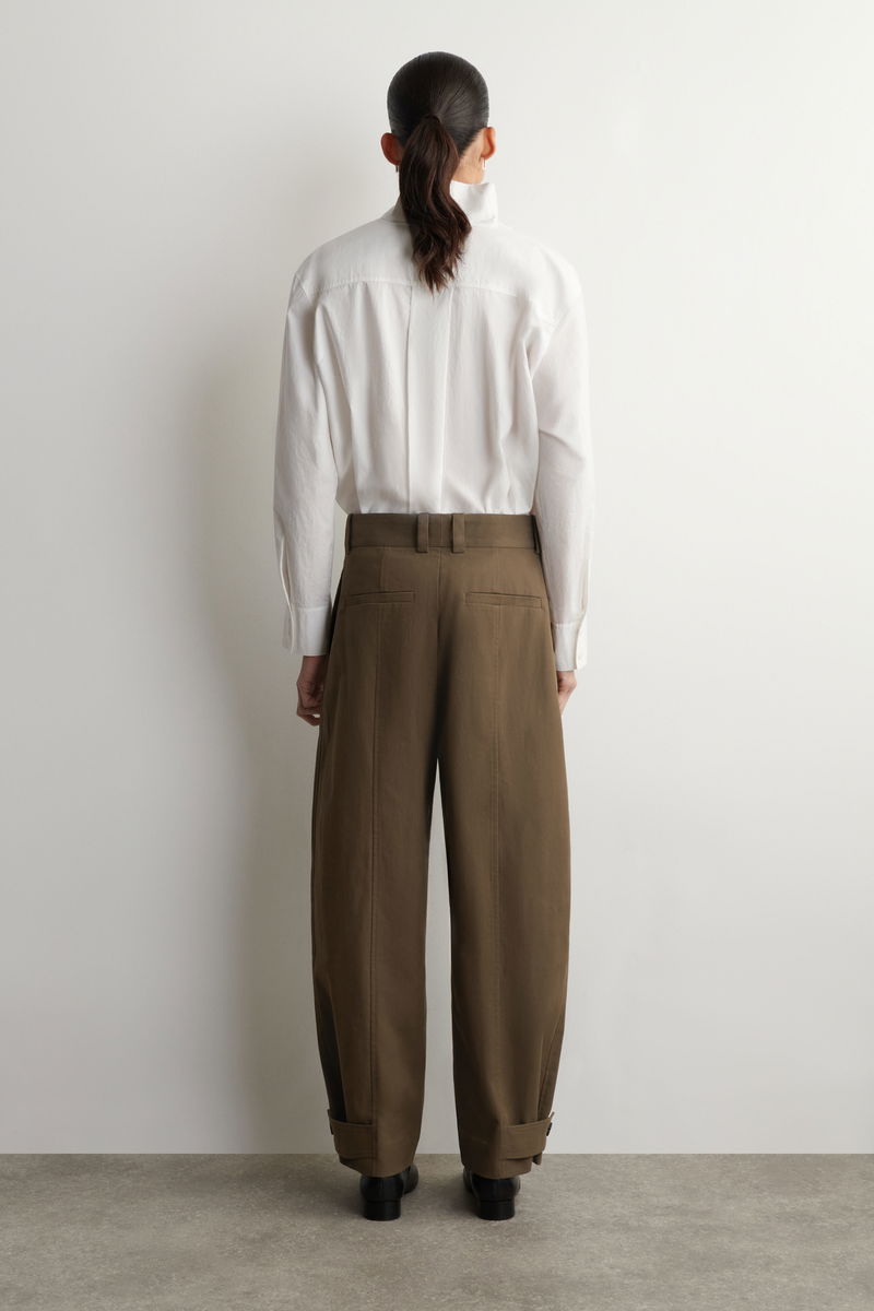 Offered in neutral beige, these utility trousers are cut in a barrel-leg shape with buttoned tabs at the ankles to temper the silhouette. They're made from a cotton-twill blend and designed with tonal seams that create a neat line through the back.