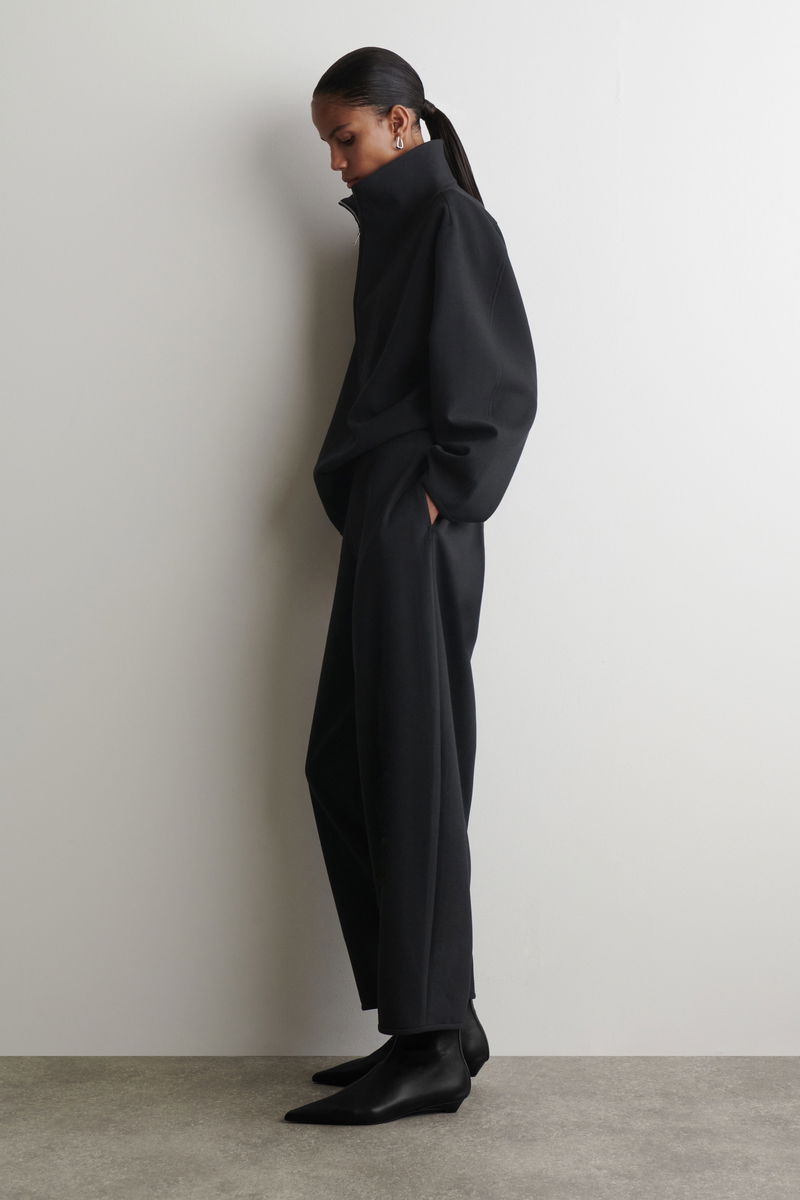 These modern trousers offer a tailored take on classic loungewear. Offered in muted charcoal, they're made from a woven fabric in a barrel-leg silhouette and feature darts at the waist and ankle to temper the shape. Style them as a co-ord with the matching top.