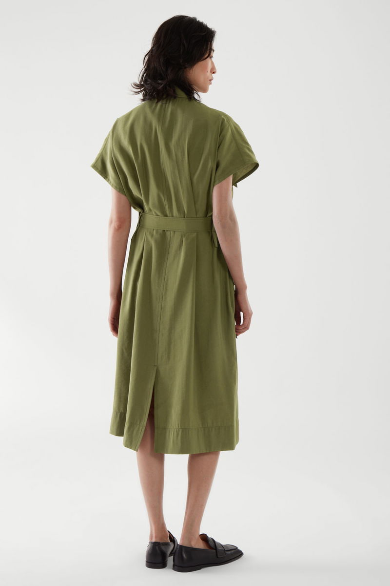 This elegant belted dress is crafted from sustainable TencelTM Modal and cut for a relaxed fit. Each piece is elevated with oversized utility-style patch pockets on the chest and side with a hidden placket that conceals durable and sustainable corozo buttons.