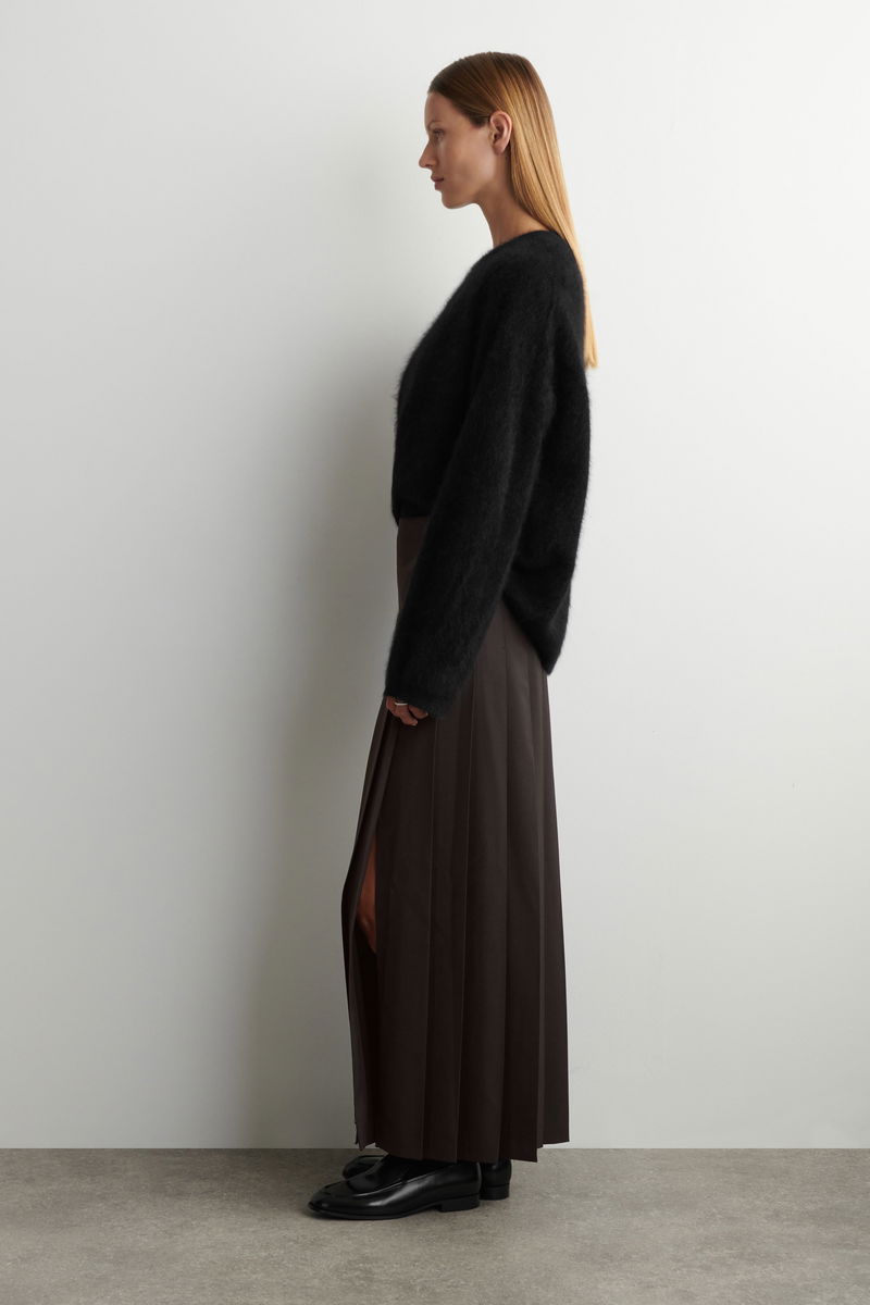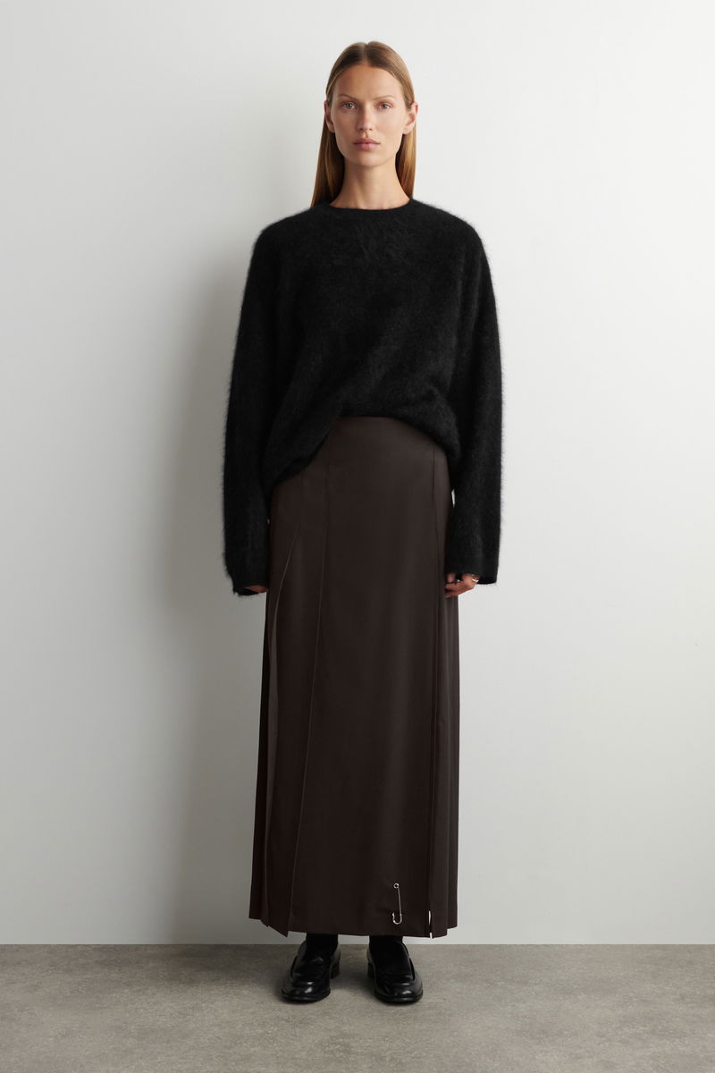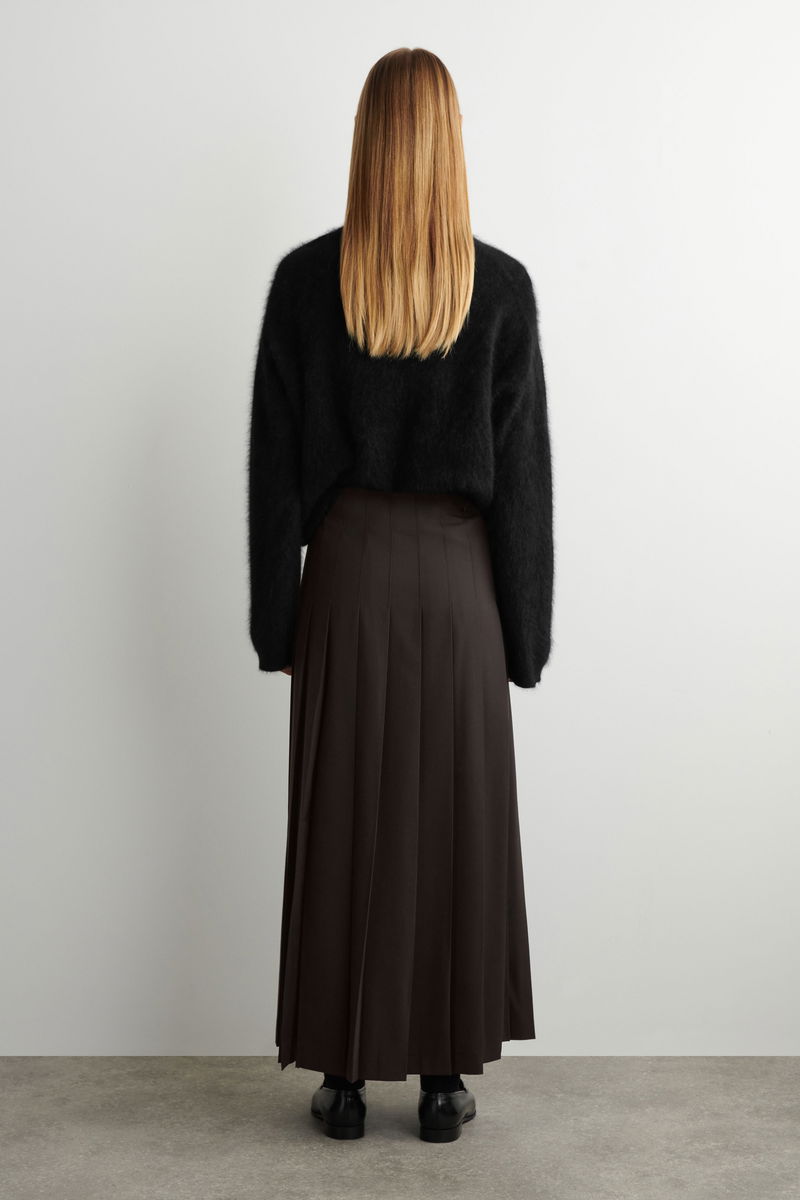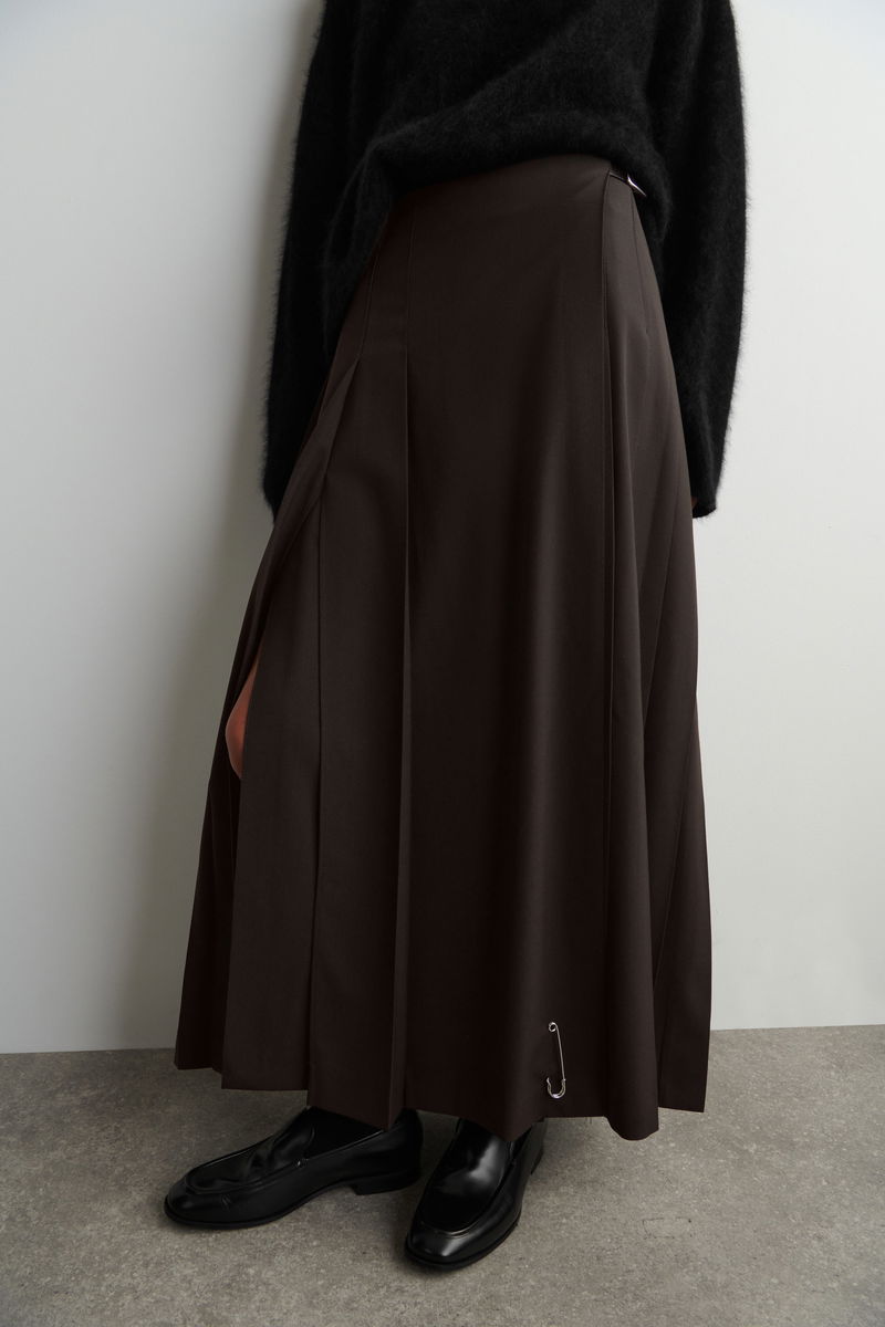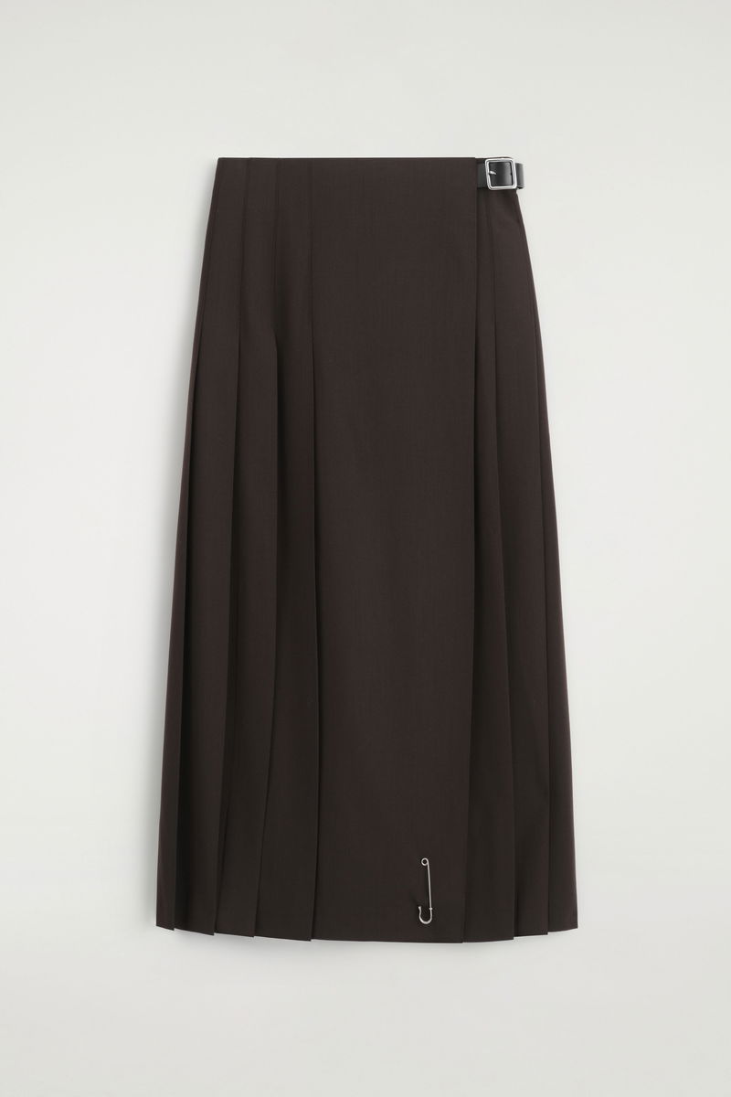 Introducing COS × Le Kilt: a modern expression of heritage design. Capturing the artistry of Scottish tradition, this maxi kilt is crafted from tactile wool-blend twill and shaped with precise box pleats and a leather belt that buckles at the waist. The brand's signature pin accents the hem – a hallmark of refined craftsmanship.