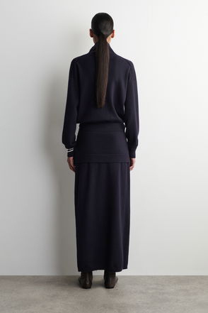 Modernising classic tailoring codes, this midi skirt is designed in a wrap-front shape that's held in place with a D-ring belt. It's crafted from RWS wool in a textural weave and tailored in an asymmetric silhouette with pleats that fall from one side. The welt pocket at the back pays homage to traditional suiting.