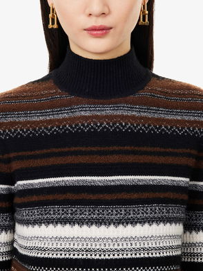 Renew your transitional wardrobe with our considered collection of knitwear. Debuting for Autumn Winter 2023, this cosy jumper is decorated with wide striped bands and a row of irregularly shaped hammered-metal buttons along one shoulder, which can be worn open or fastened to create a high turtleneck. It's crafted from 100% RWS-certified wool in alternating ribbed and plain stitches, adding texture to the knit.