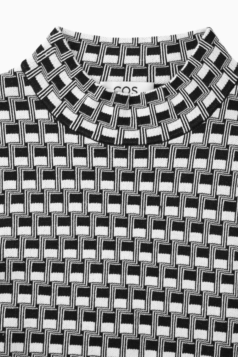 This modern top is a great way to add some pattern to your wardrobe. Jacquard-knitted with a geometric design it's crafted from an organic cotton blend and has a high neck for extra warmth. Complete the look with the matching flares.
