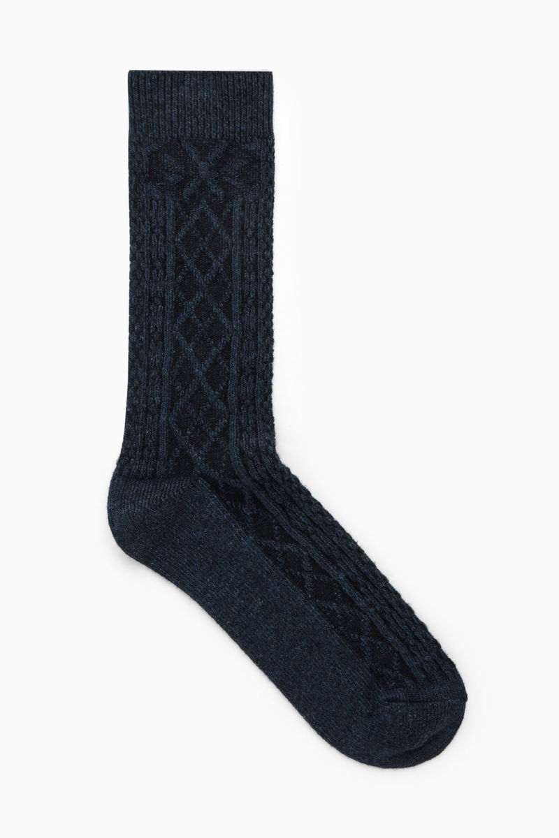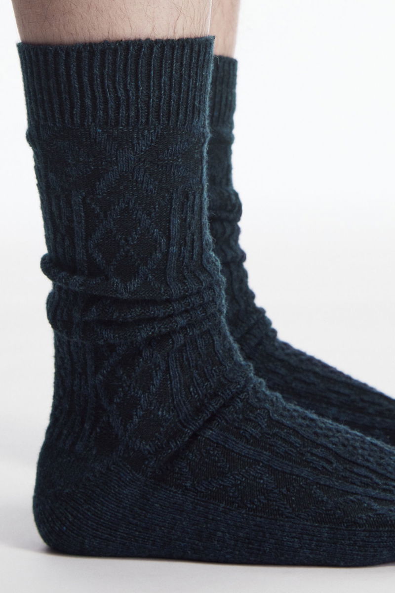 Crafted from a cosy blend of cotton, recycled wool and cashmere, these chunky socks combine two heritage-inspired techniques: argyle and cable knit. The ribbed cuffs will prevent them from sliding down.