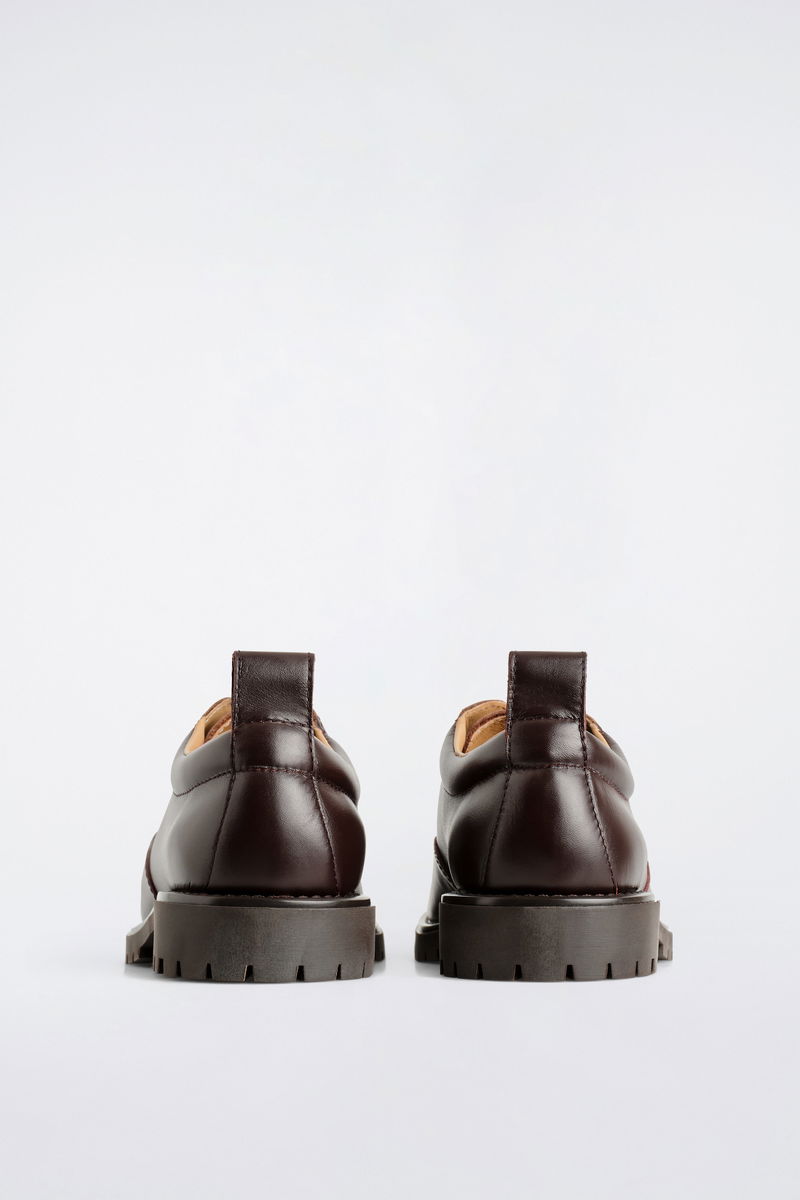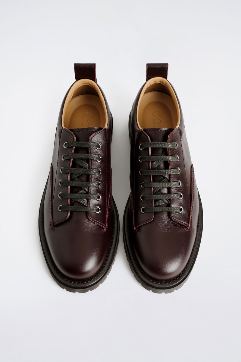 This season, the menswear team modernise the classic Derby shoe. This refined pair is crafted from premium leather in a rich mahogany tone and features rounded toes, waxed-cotton laces and stitched details. They're finished with pull tabs and chunky yet lightweight soles.