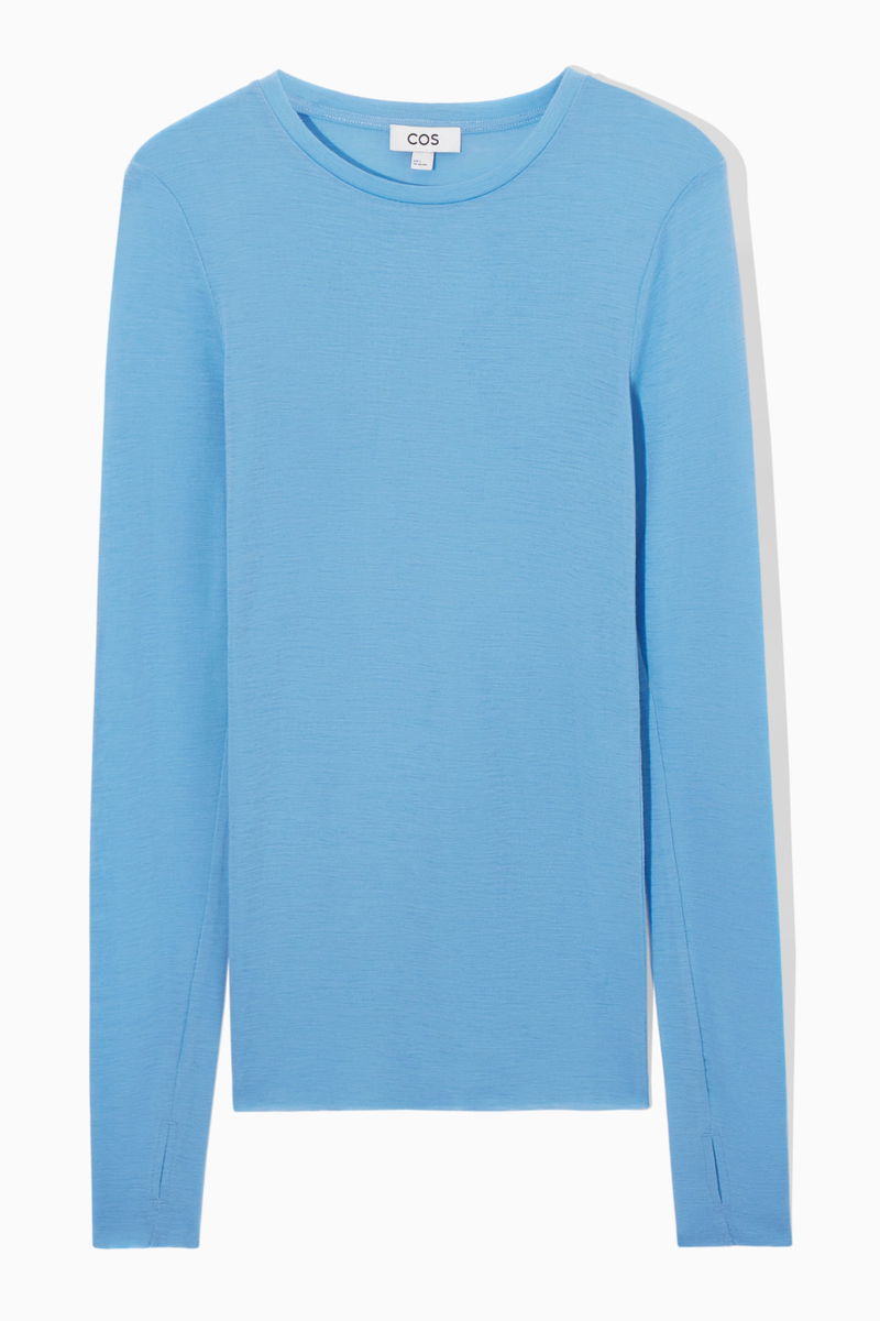 Anchor your transitional wardrobe with this staple long-sleeved top. Offered in a fresh sky-blue hue, it's crafted from 100% merino wool that has been certified according to the Responsible Wool Standard and has a streamlined slim fit that's ideal for layering. It's designed with a high roll-neck collar and subtle thumbhole cuffs.