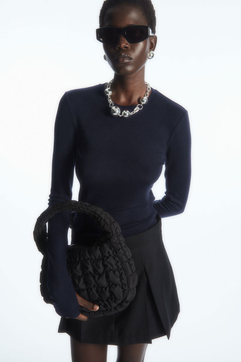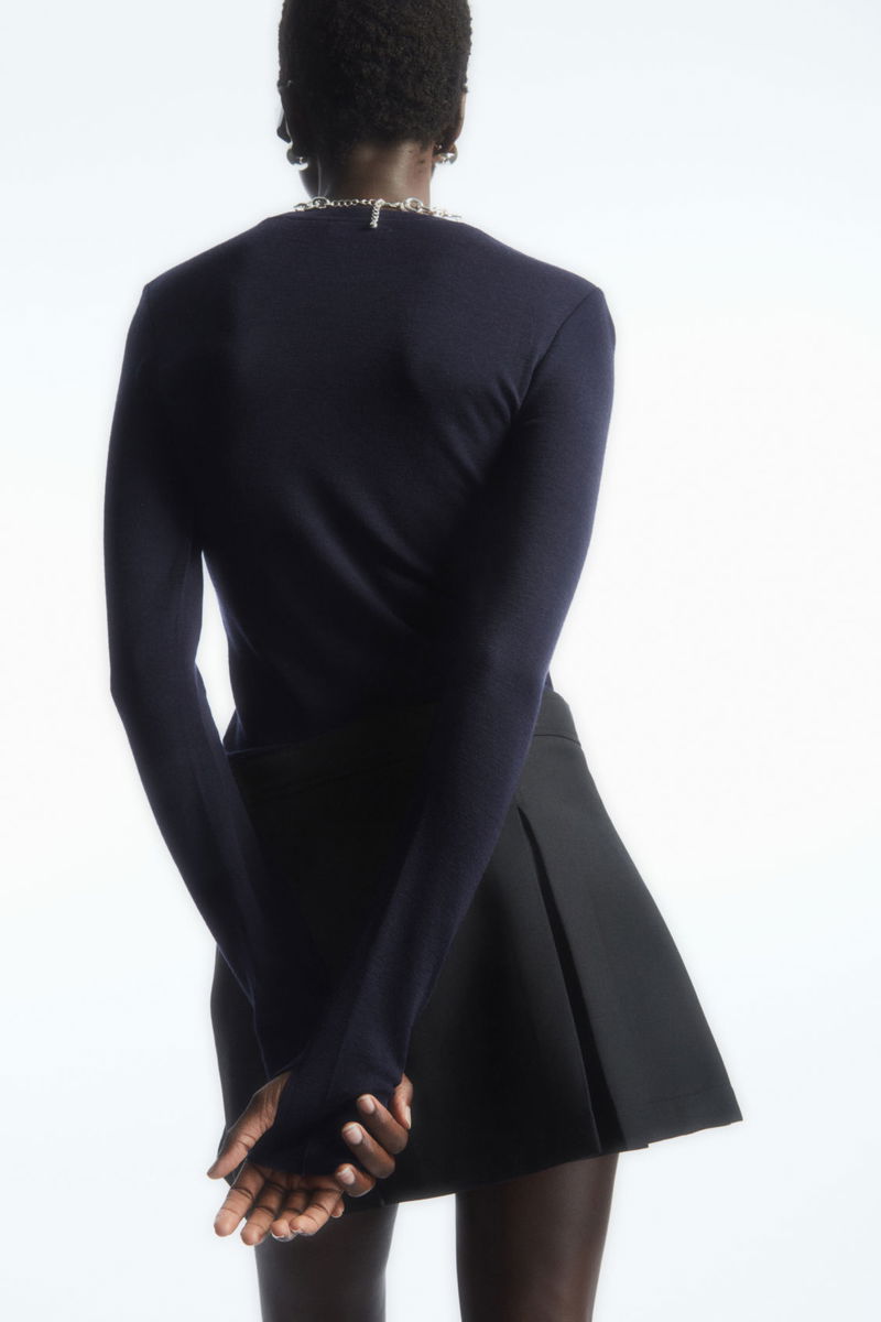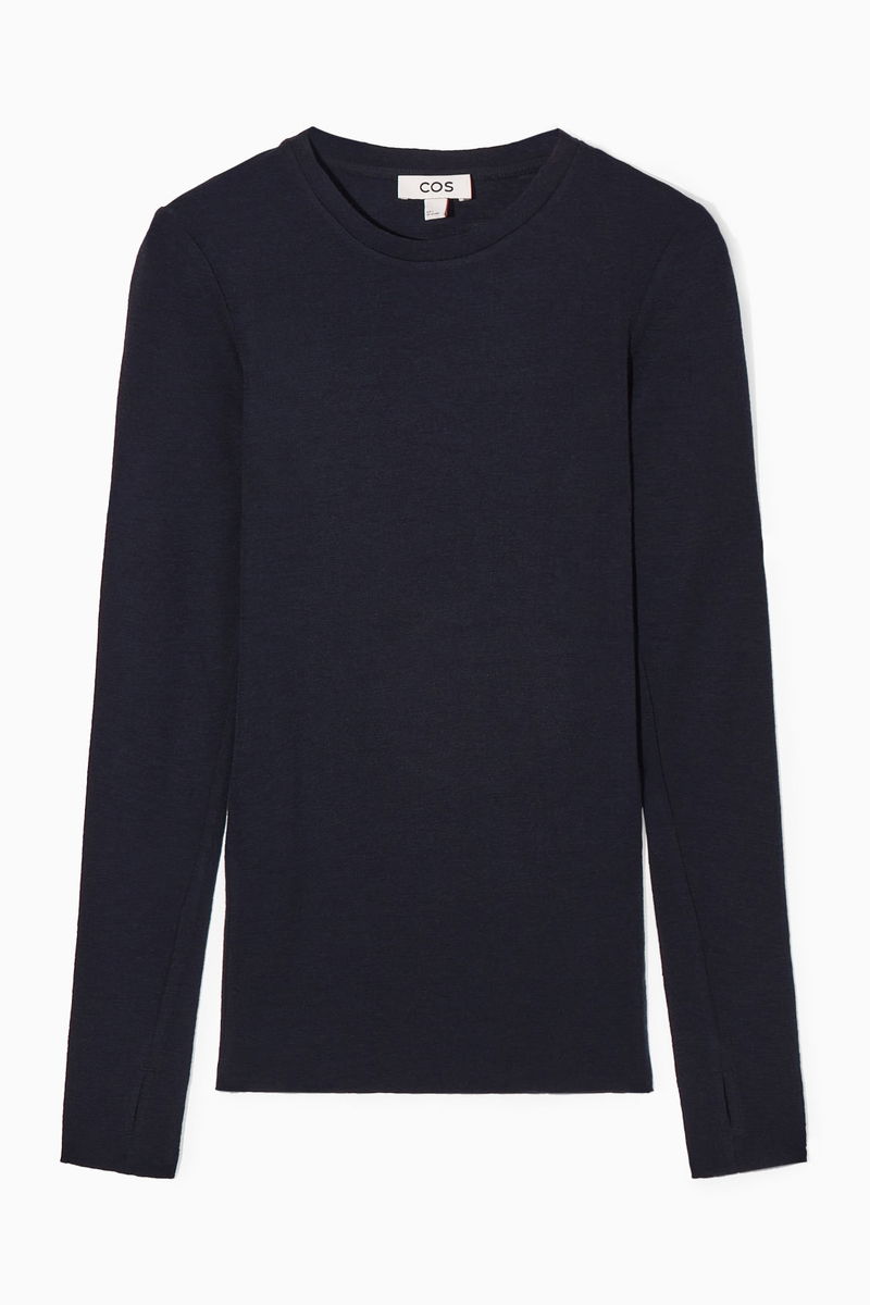 Anchor your transitional wardrobe with this staple long-sleeved top. Offered in a versatile dark-navy hue, it's crafted from 100% merino wool that has been certified according to the Responsible Wool Standard and has a streamlined slim fit that's ideal for layering. It's designed with a high roll-neck collar and subtle thumbhole cuffs.