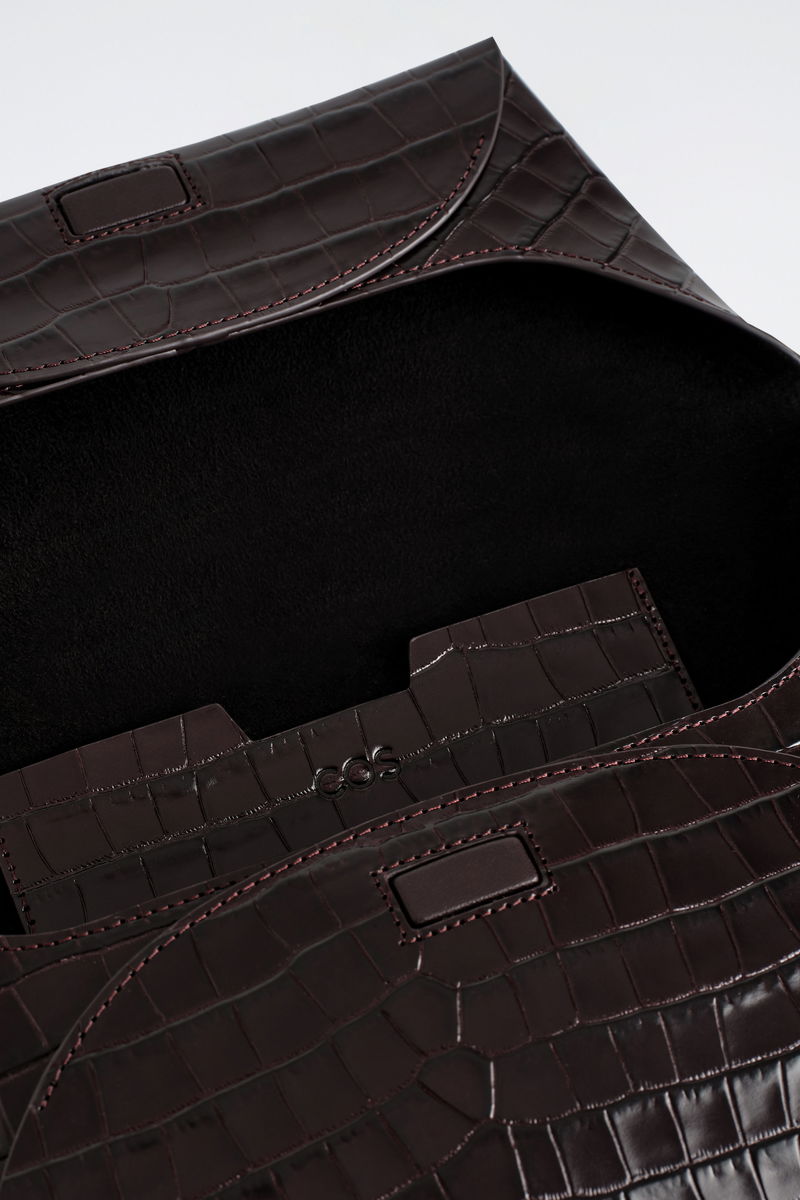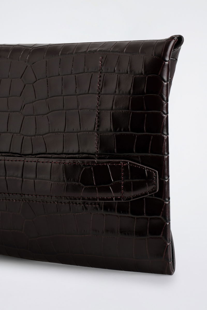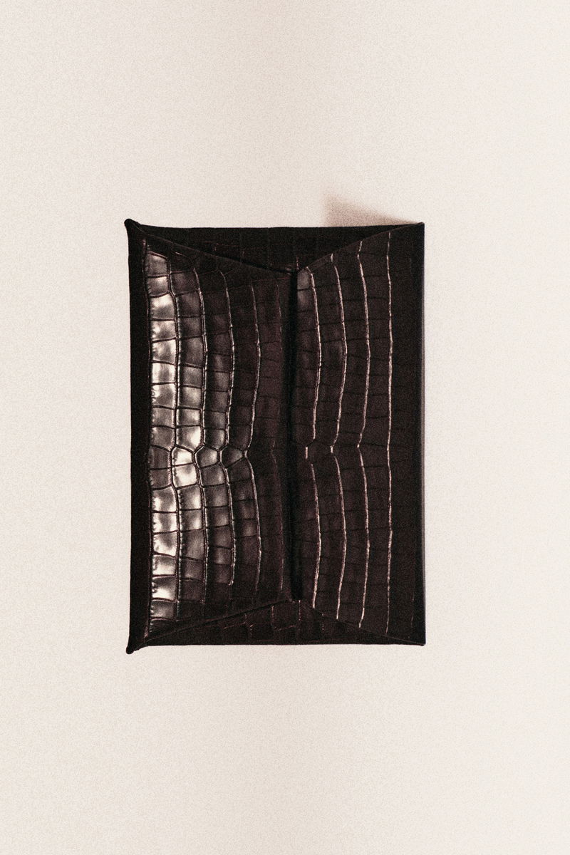 This modern pouch will keep you organised in the city and beyond. Offered in a rich ebony tone, it's expertly crafted from patent crocodile-effect leather and has a spacious compartment to fit your passport and other documents.