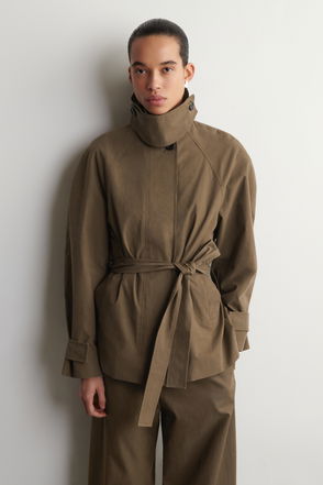 This hybrid piece seamlessly fuses elements from the classic trench coat and cape. It's crafted from an organic-cotton blend and has a modern oversized shape that adjusts with buttoned sleeves. A concealed placket ensures a clean finish, while the draped silhouette has timeless appeal.