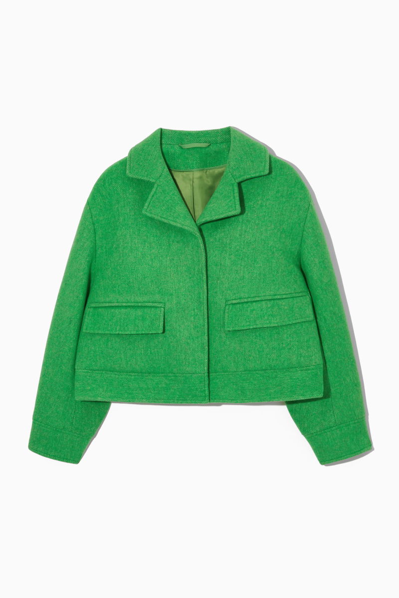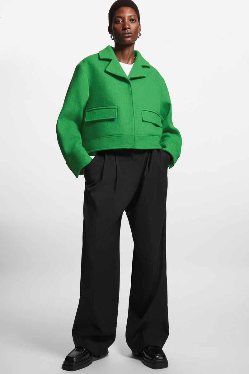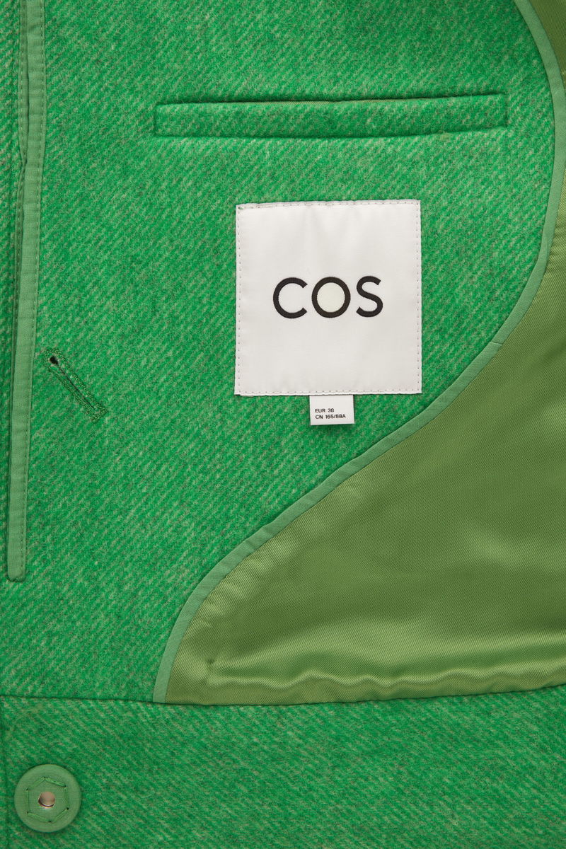 Crafted from a recycled wool blend that's soft and fluffy, this short coat is designed for an oversized, boxy fit that's enhanced by the cropped body. It has a concealed placket and tonal organic corozo buttons with a full spread collar and wide flapped pockets. The bright green mélange finish adds a modern touch.