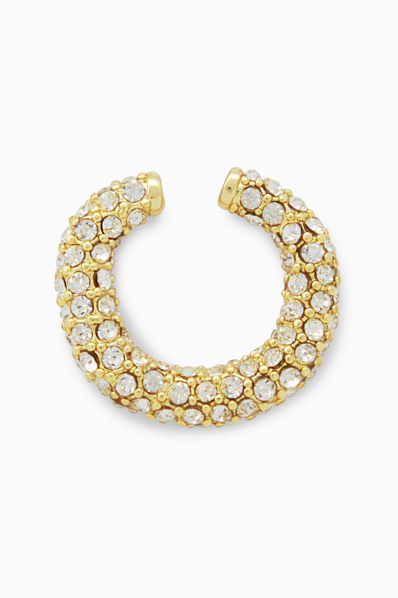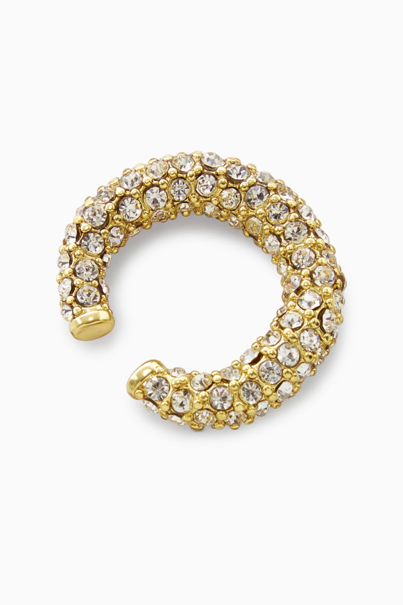 This ear cuff is embellished with rows of sparkling crystals that catch the light. Designed to securely slip onto the ear, it's crafted from recycled brass with a gold-tone finish.