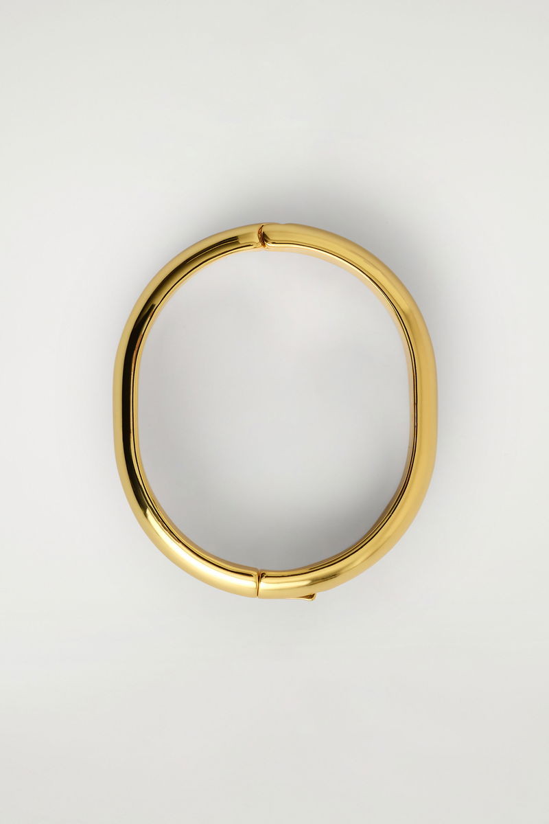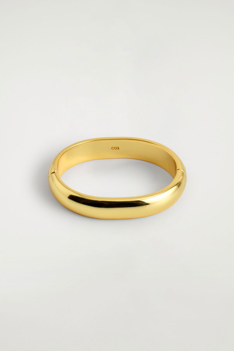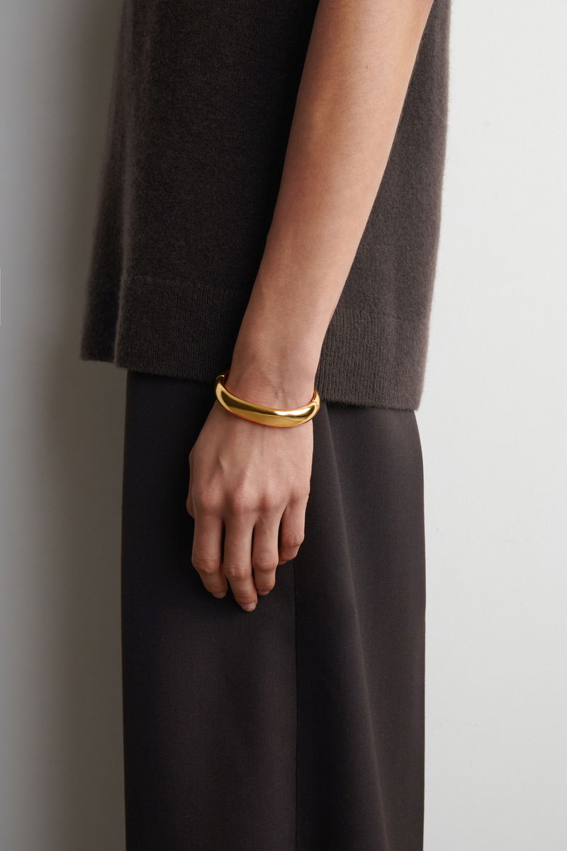 This refined bangle is simple yet impactful. It's crafted from recycled brass that's plated with gold for a polished shine and designed in a curved shape that wraps around the wrist. Style it with mixed metals for a modern take on layering.