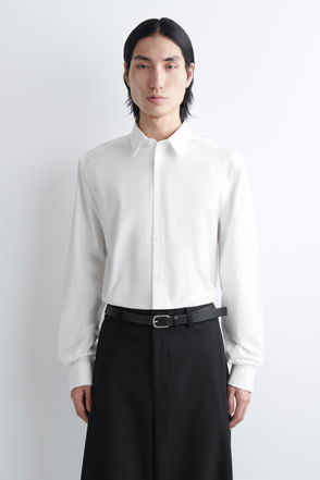 Crafted from lightweight and breathable linen, this airy white shirt is cut for a relaxed fit that falls loosely over the form. Finished with a classic spread collar and curved hem, this long-sleeved style promises to be a wardrobe staple throughout the warmer months.