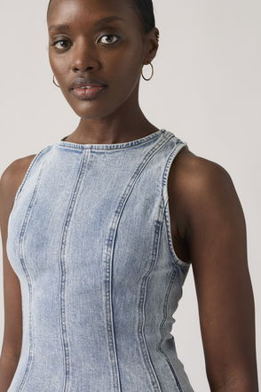 The classic peplum top is reimagined for Spring Summer 2025. This modern piece is made from dark-blue denim and designed with contourting waist darts and a keyhole cutout at the back that closes with tonal ties.