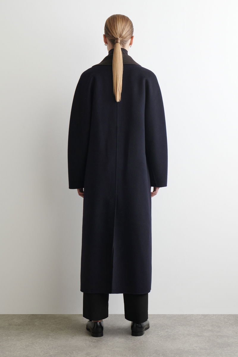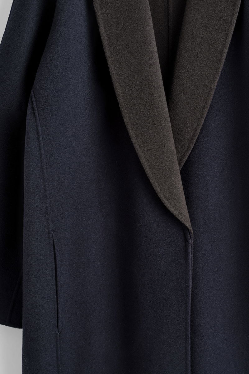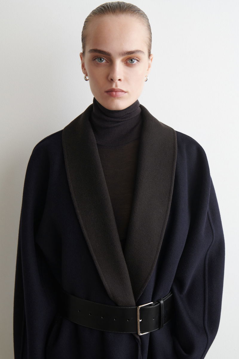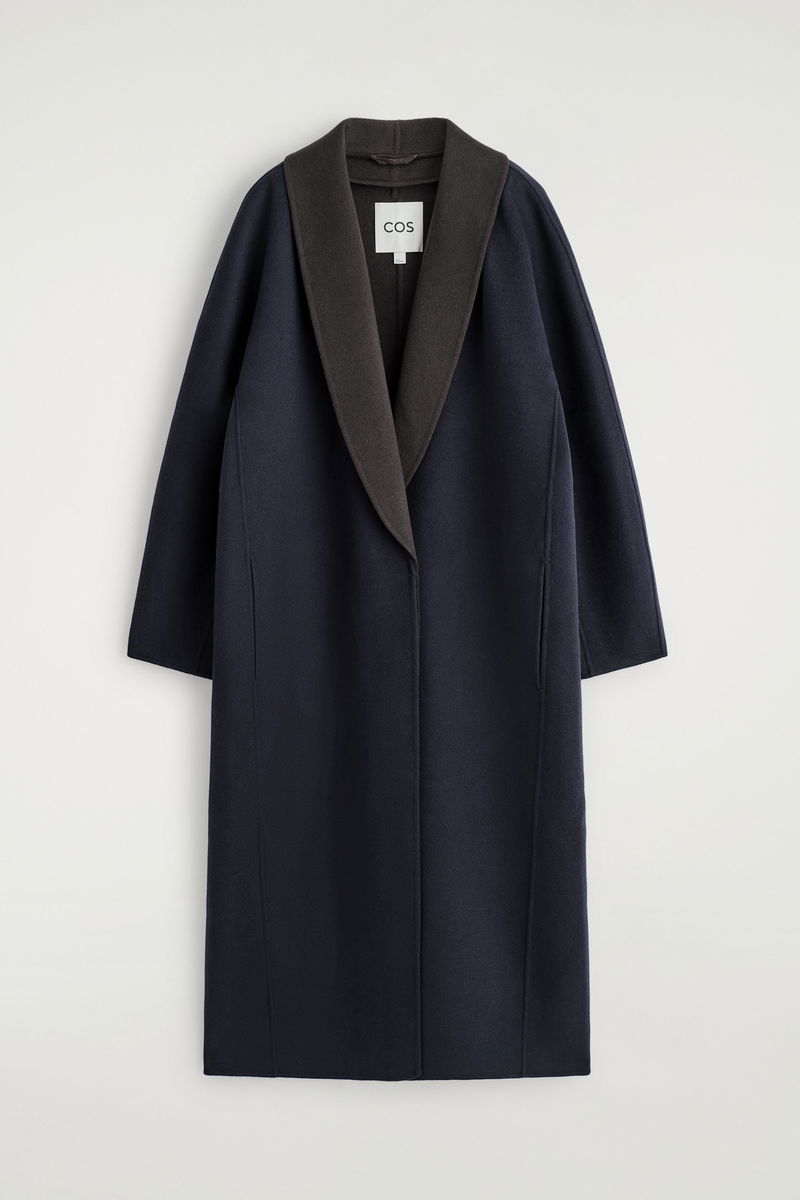 This understated wool coat reframes '80s sartorial codes for the modern wardrobe. Double-faced for a premium handle, it's cut in a softly sculpted silhouette and features shawl lapels in rich chocolate brown that subtly contrast the midnight-navy tone.