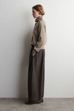 These modern trousers are an evolution of house codes. The lightweight TENCEL™ Modal-blend fabric has a soft sheen that catches the light, while the deep colour palette proposes an elevated option for evening. Style them with the matching top.