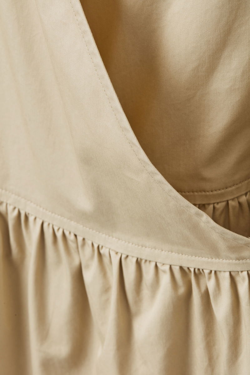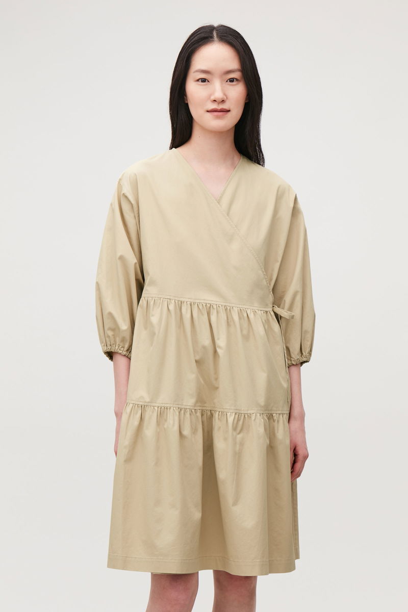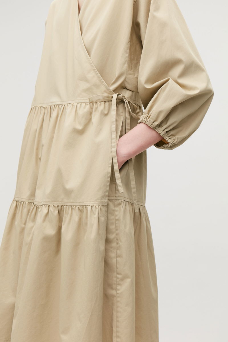A mid-length style with elasticated gathered panels, this wrap dress is made from a velvety-soft cotton with a light, crisp quality. Cut for an A-line fit, it has subtle fabric tie fastenings placed at the sides, discreet side-seam pockets and wide, curved ¾ sleeves with elasticated cuffs.