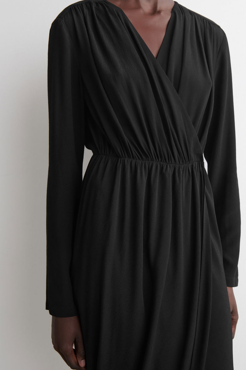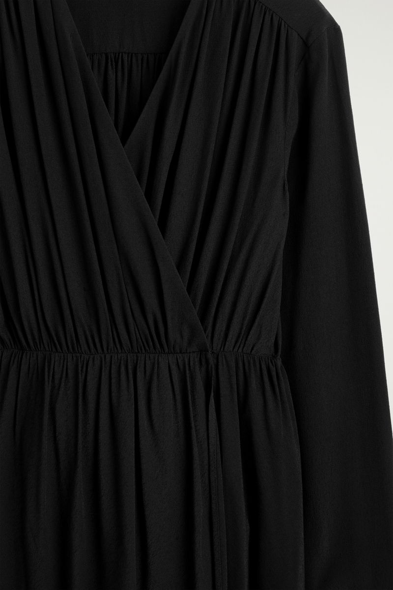 GATHERED MIDI WRAP DRESS