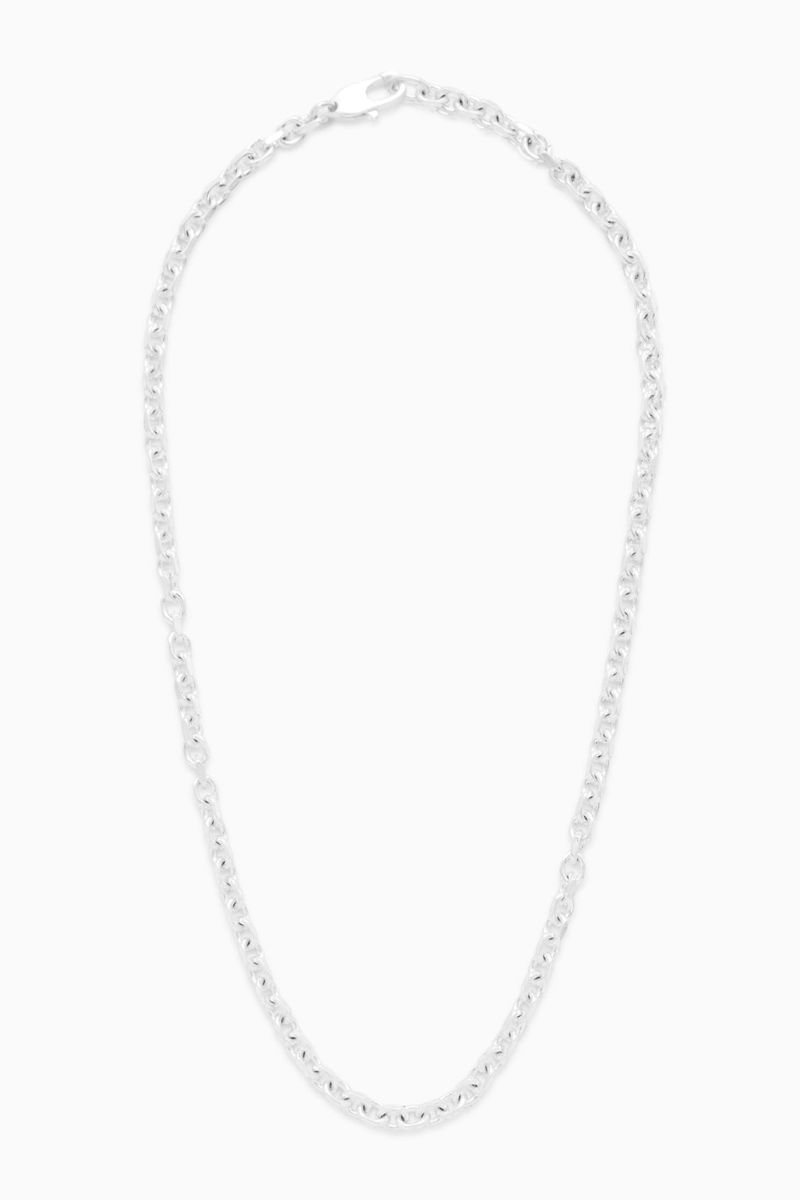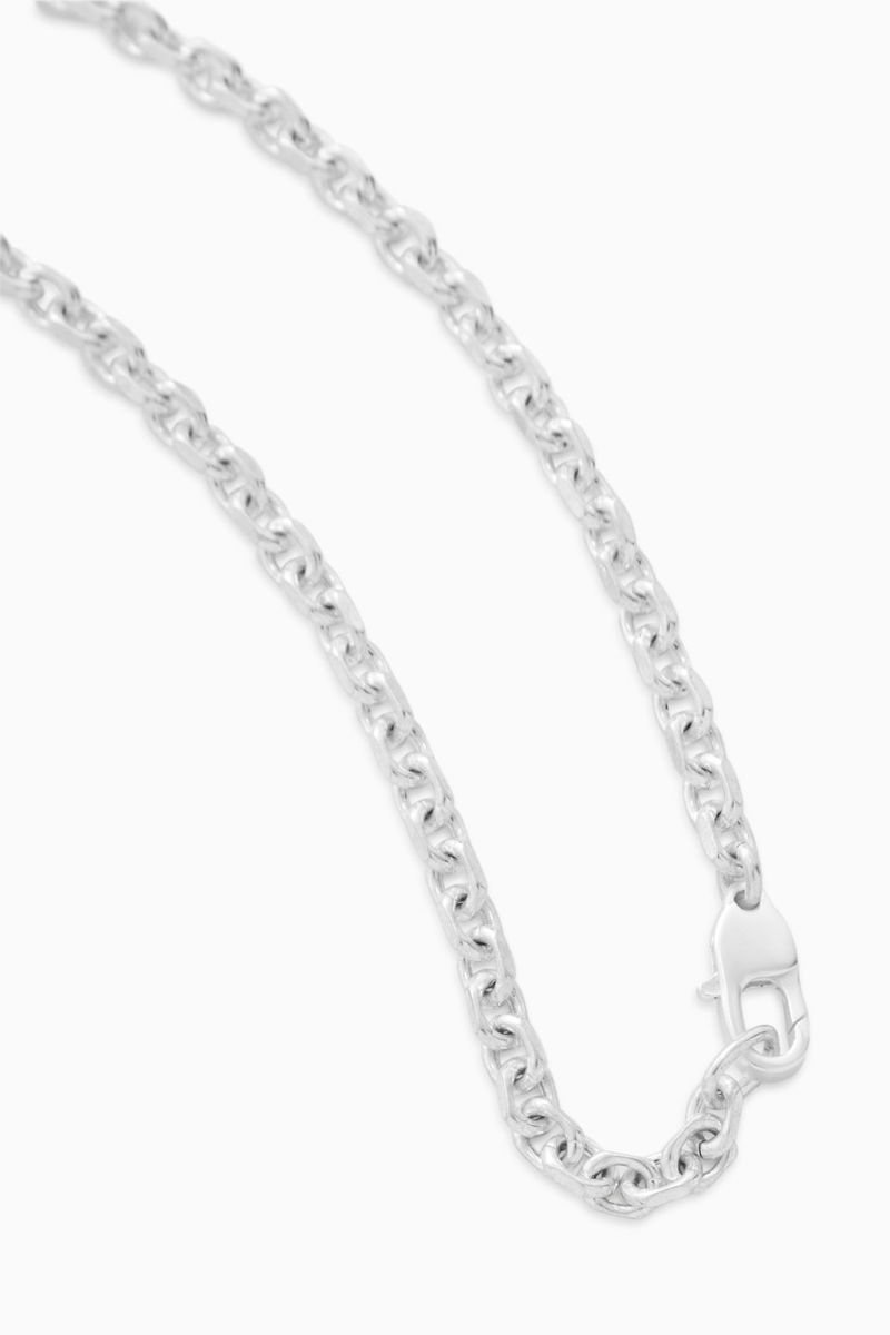 The COS design team have been working on a cohesive jewellery capsule that's inspired by the world of geometry and functional shapes. Part of the collection, this minimal chain necklace is crafted from recycled brass with a brushed silver-tone finish. It consists of offset oval links and can be worn with anything from a T-shirt to a leather shirt.