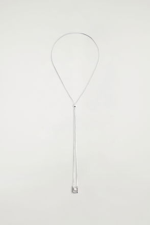 This season, the COS jewellery designers explore materiality through tactile surfaces and organic shapes. Suspended from a leather ribbon, this modern pendant necklace is hammered into an irregular, molten silhouette and crafted from silver-plated recycled brass with a subtly tarnished patina.
