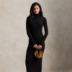 Cut with extra room for movement through the chest and sleeves, this lightweight crepe dress features hemline side slits for ease of movement. It is finished with a high cowl neckline.