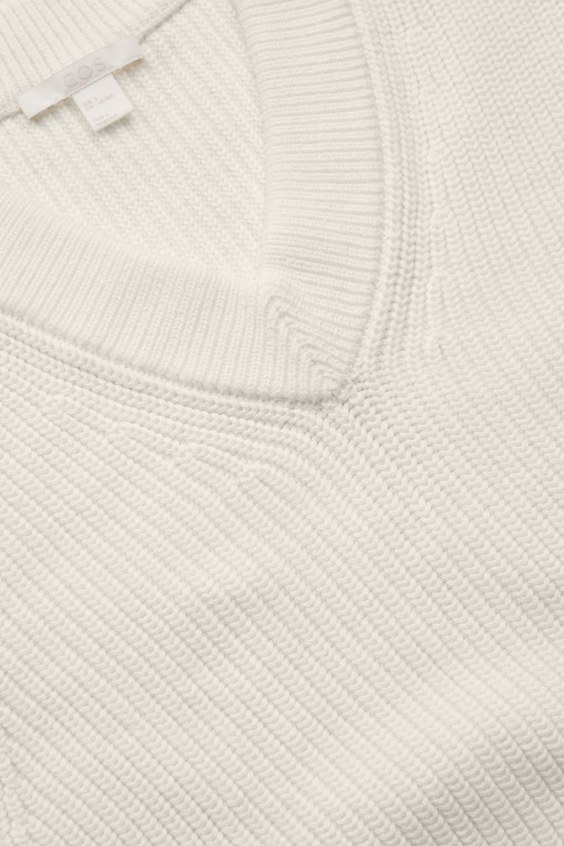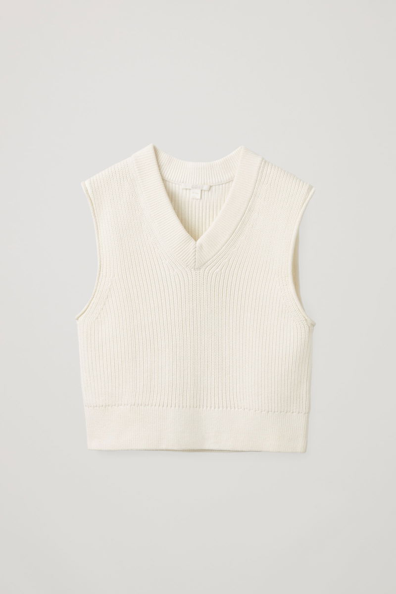A modern take on a traditional knit. Crafted from organic cotton, this V-neck knitted vest is cropped with a simple ribbed finish for a simple warm-weather layer.