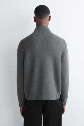 Made from a structured wool-blend jersey with a touch of stretch, this jacket has an extra-high neck that is designed to be worn caped over your shoulders. A straight fit in a long length, it is finished with an exposed double-ended metal zip along the front and neat edges.