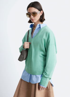 The stacked V-neckline on this jumper creates the illusion of an effortlessly layered look. It's rib-knitted from premium merino wool in a subdued light-grey tone and has modern turn-up cuffs.