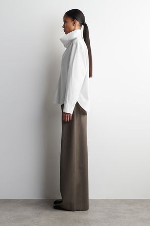 Undone silhouettes bring a relaxed appeal to classic shirting. Crafted from soft cotton, this piece has a modern open collar that slouches back towards the shoulders for an effortless look. Style it with tailoring and loafers.