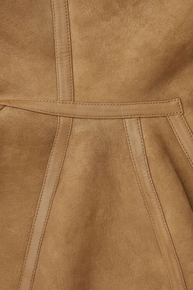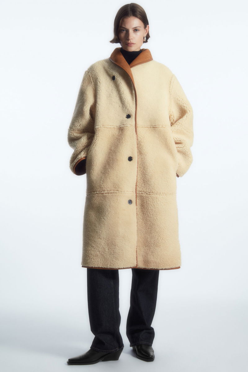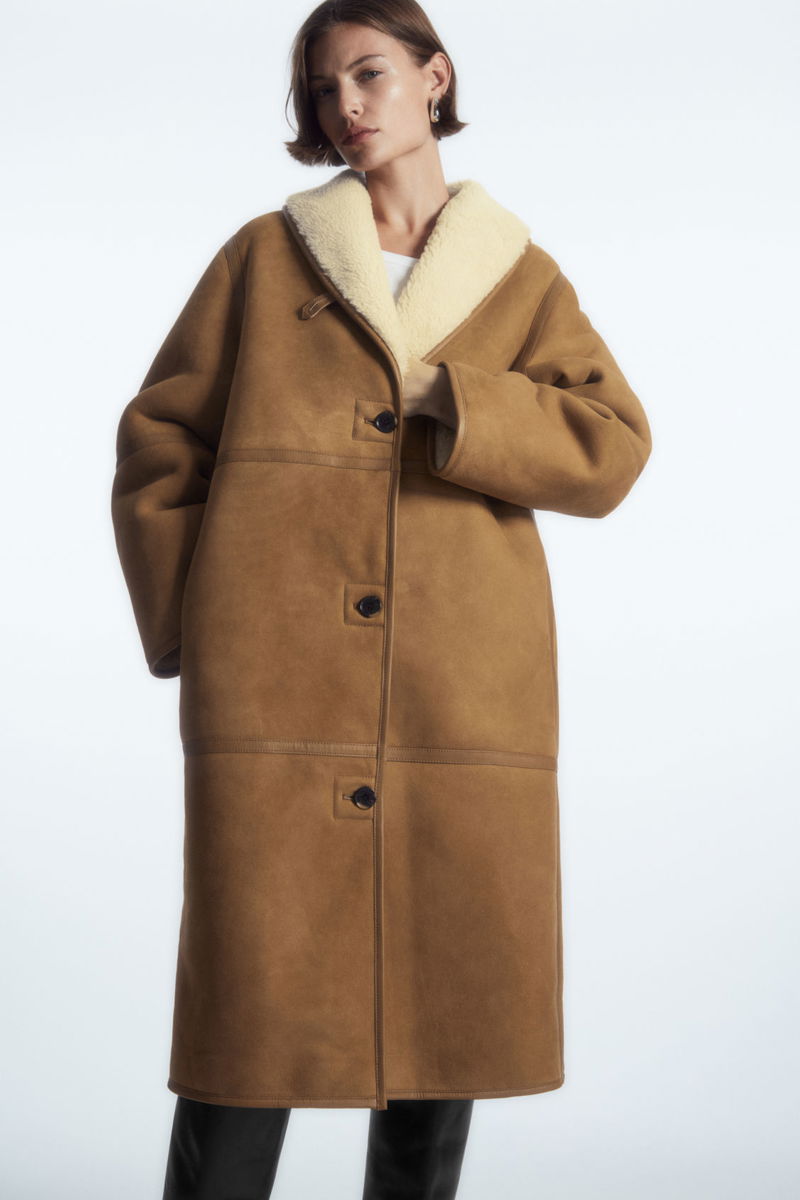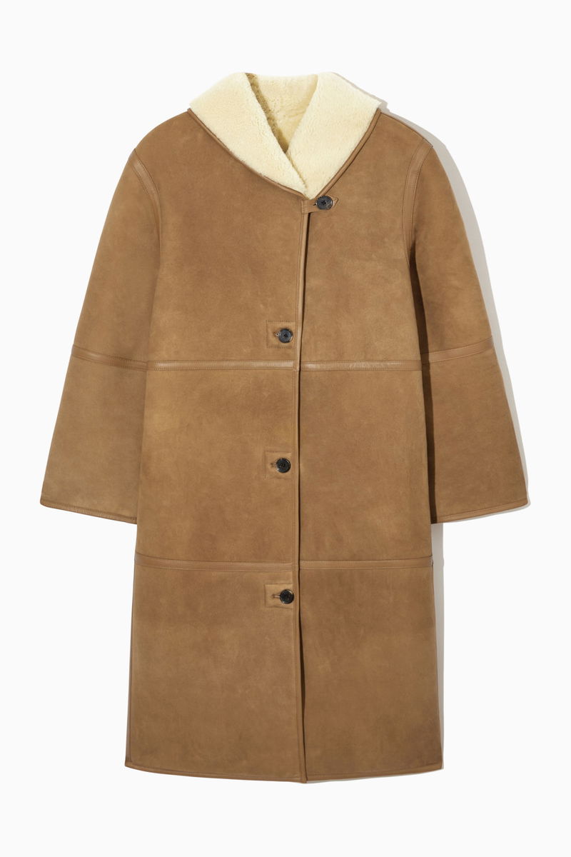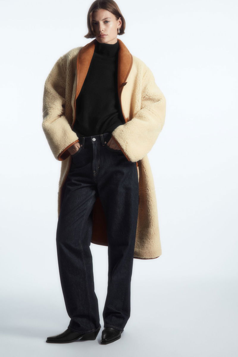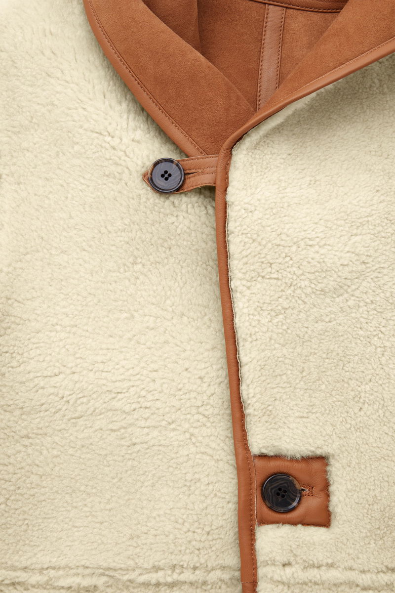 A quality shearling coat is a true winter hero, and this oversized one has all the hallmarks of a lifelong wardrobe treasure. Offered in a rich caramel hue, it is crafted from the most supple shearling and innovatively designed to be fully reversible, so it can be worn with the luxuriously plush cream underside facing outwards. Design details include the curved shawl collar, subtle side pockets and premium leather-taped edges that give it structure.