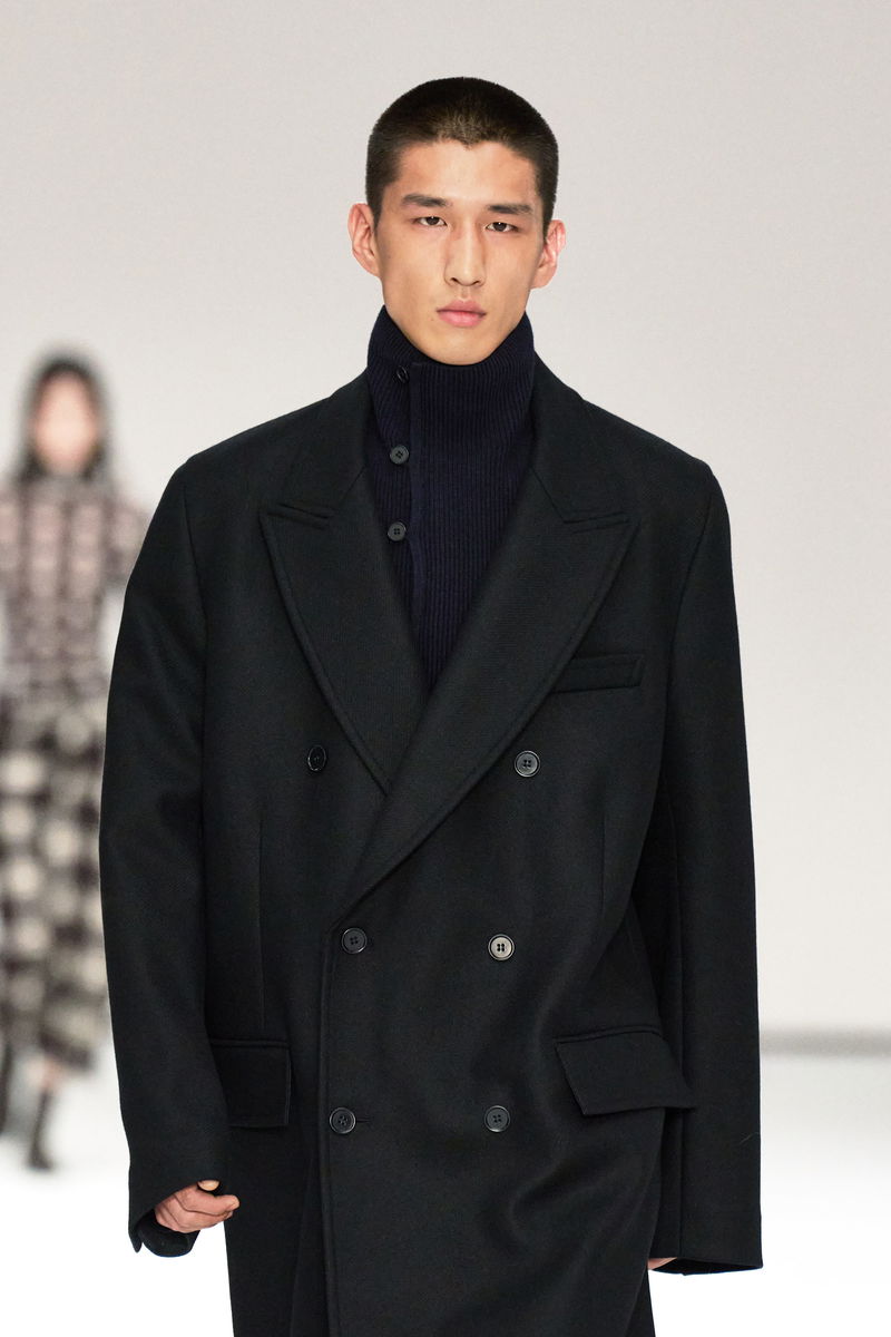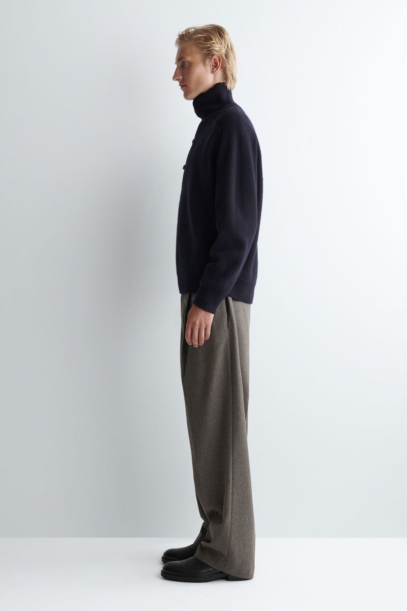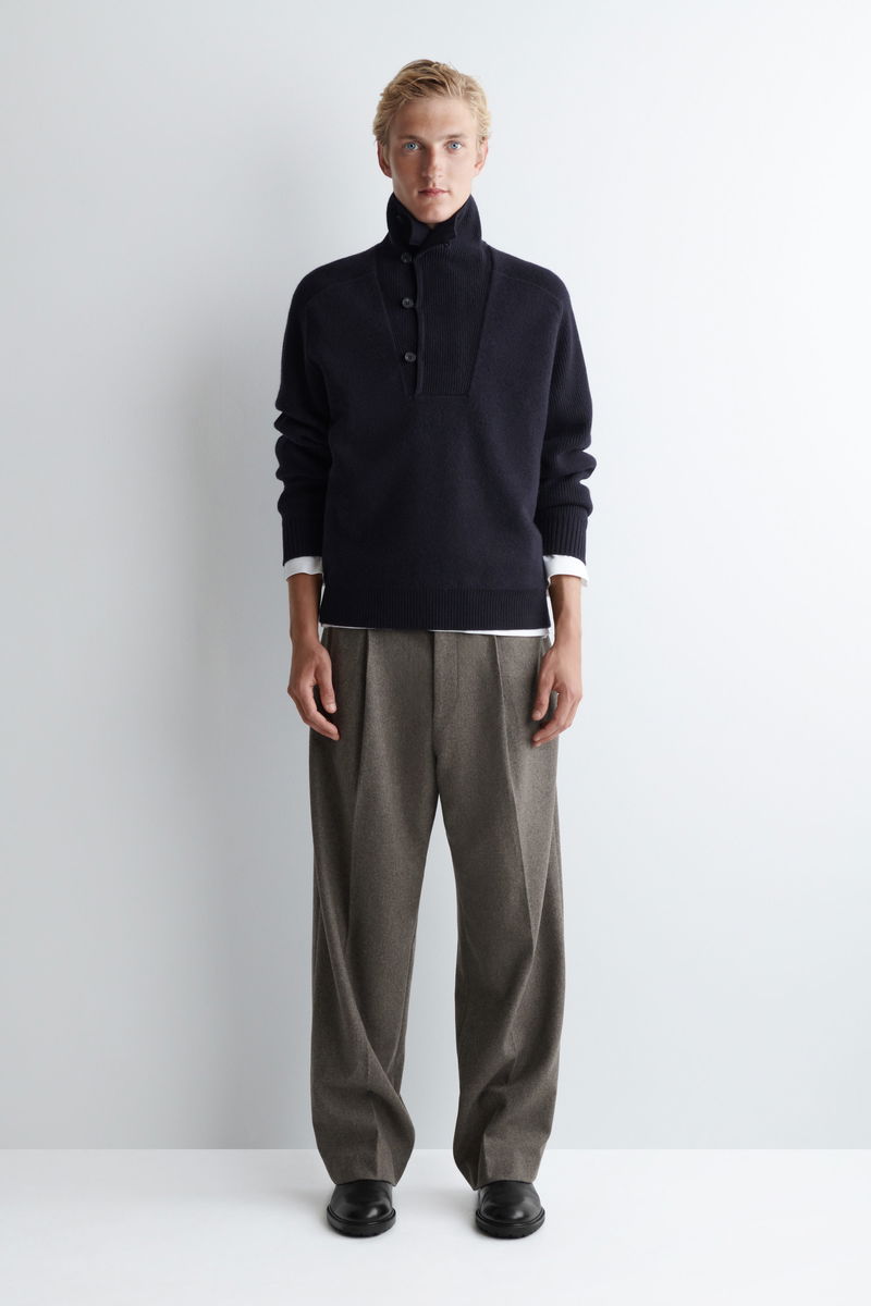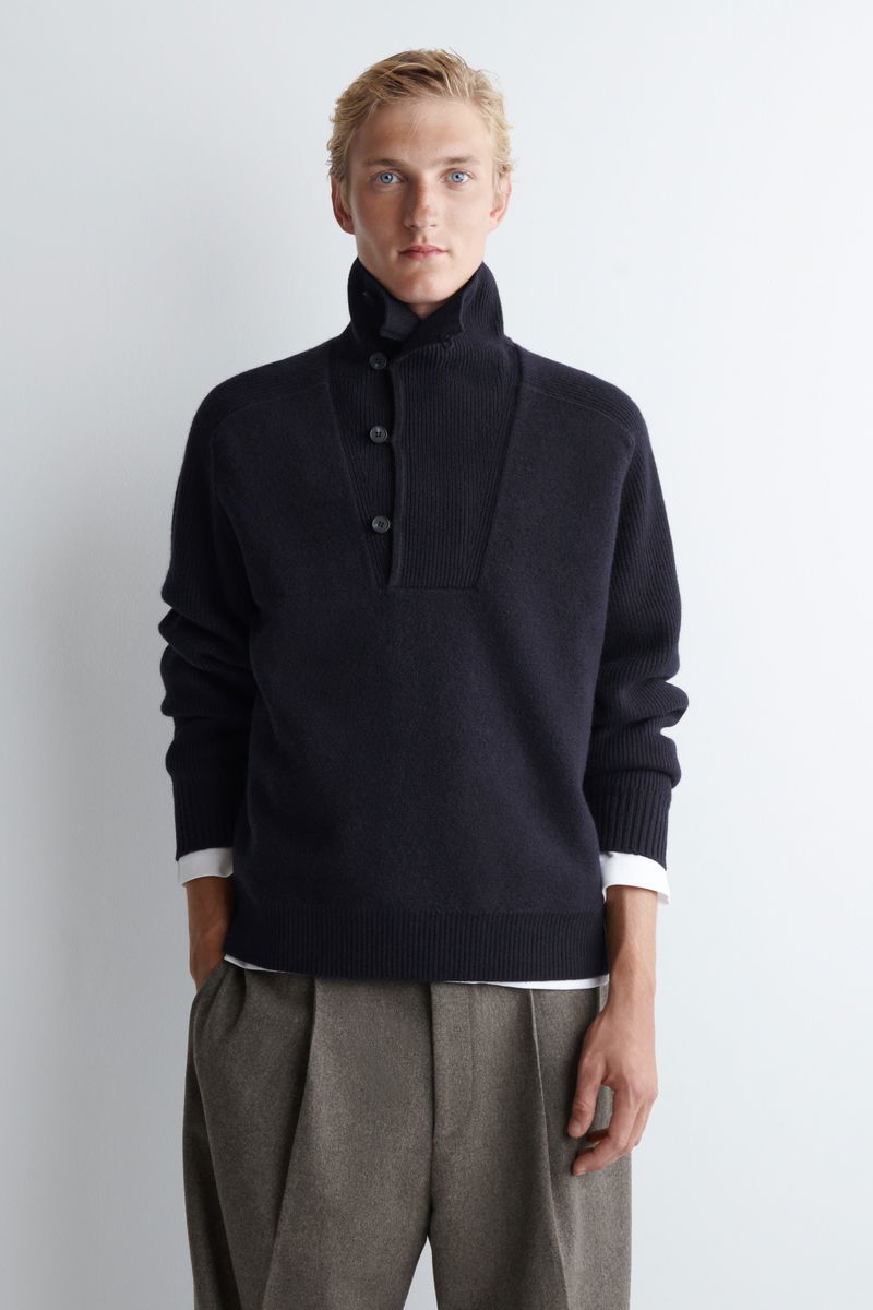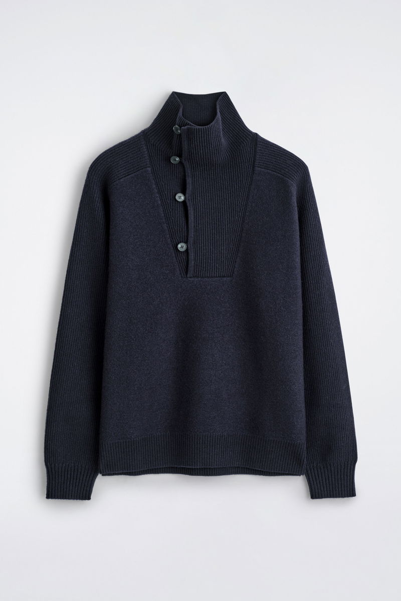 It's cut in a relaxed shape and designed with a high funnel neck that buttons to one side and can be worn open or closed. Style it with dark-wash denim.