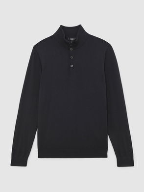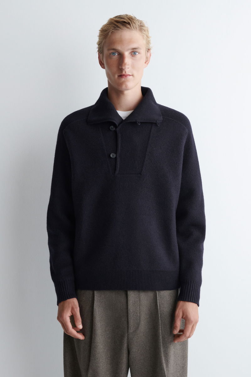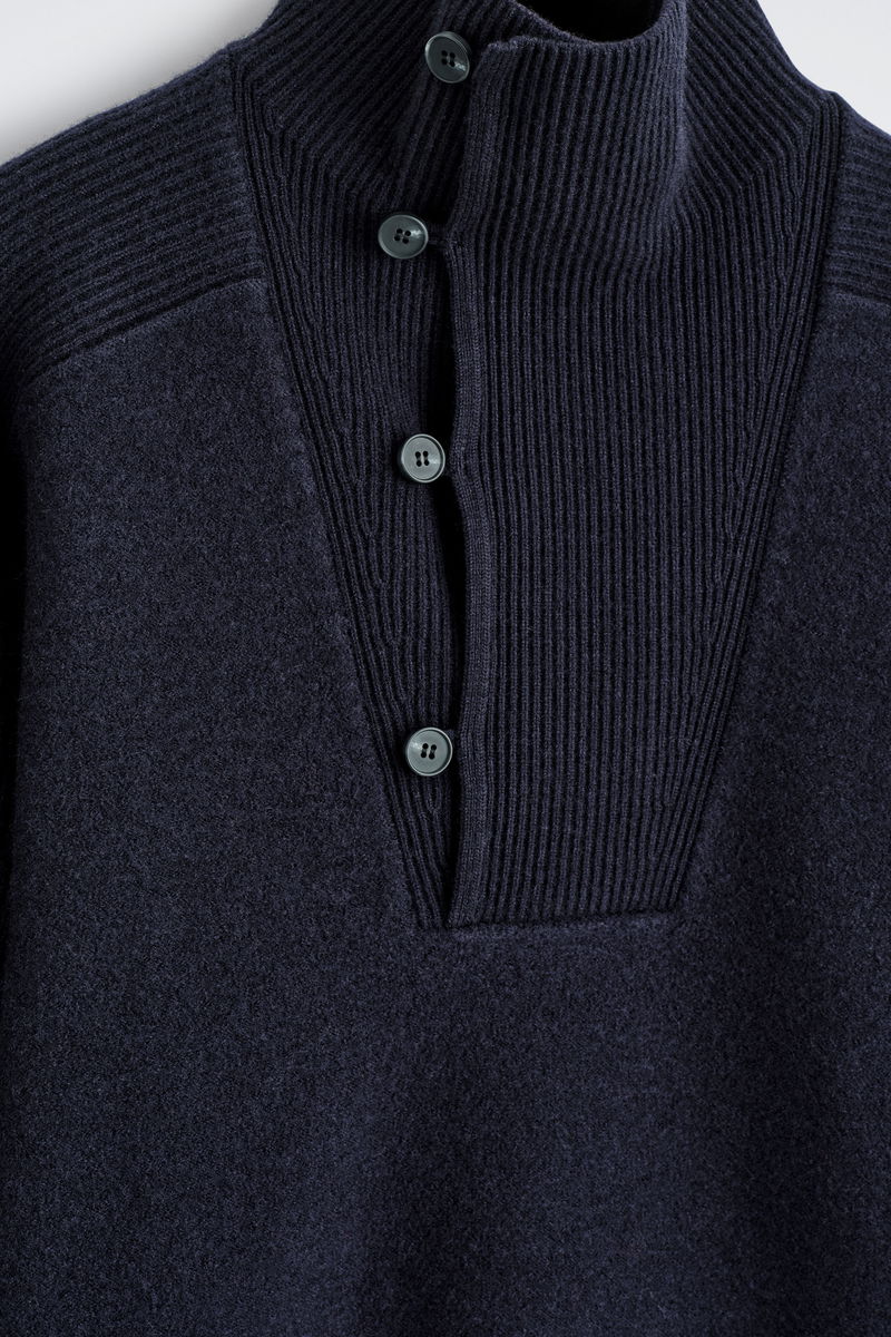 Offered in a rich navy hue, this modern jumper is designed with contrasting boiled-wool and ribbed-knit panels that create dynamic texture.