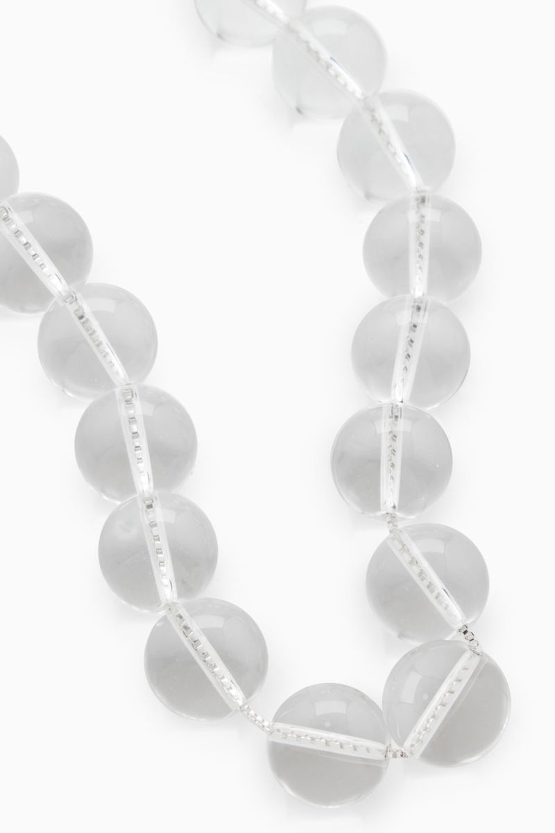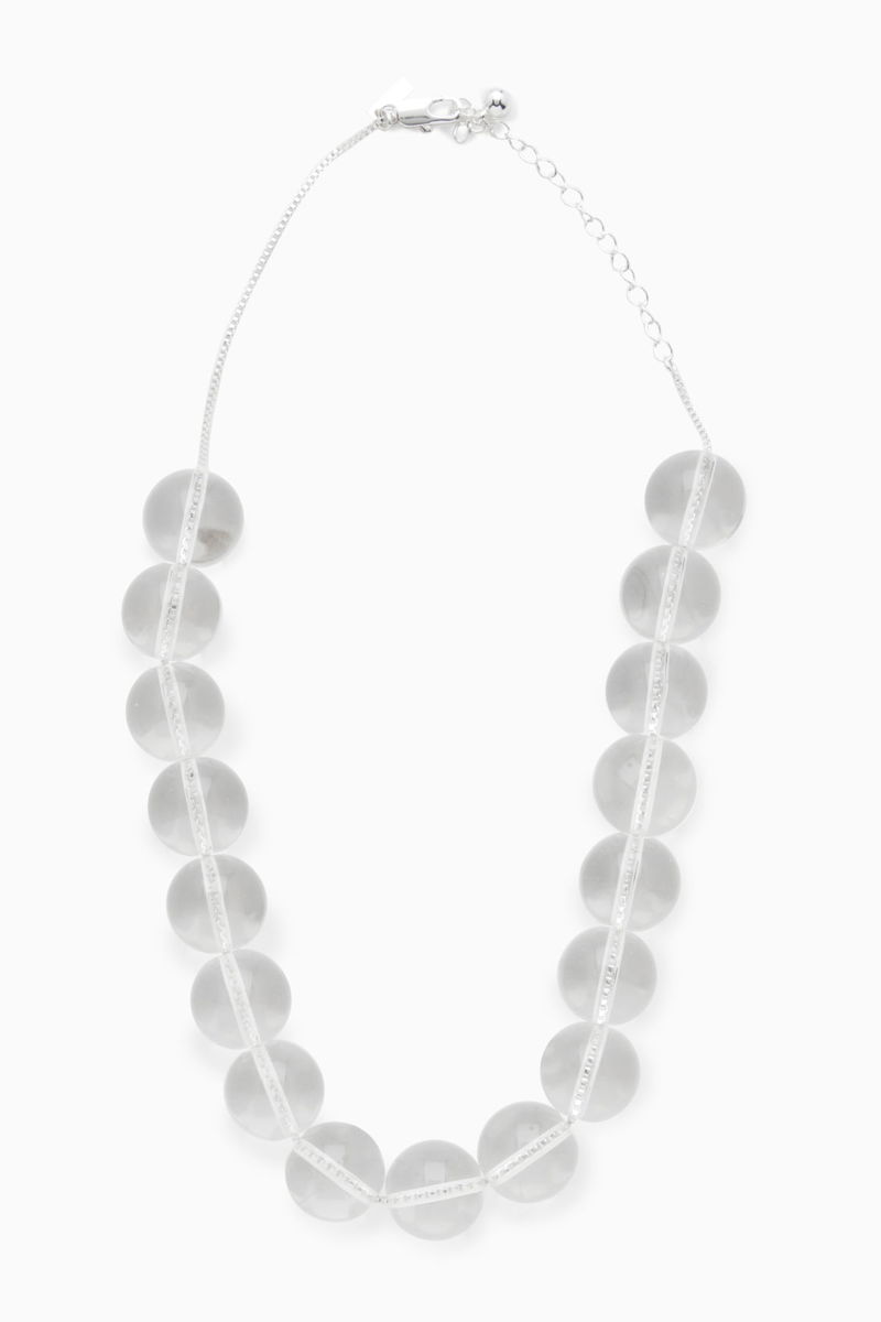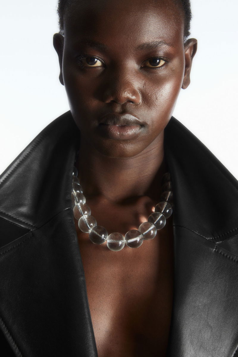 Minimal jewellery may have reigned supreme for a few seasons, but this Spring Summer sees statement pieces return in a big way. Tapping into the trend, this chunky necklace is strung with transparent recycled-glass beads, whose smooth, spherical shape sits flush against the collarbone. It'll add a directional touch to anything you wear it with.