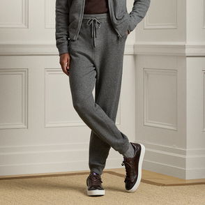 Updated with an extra-soft feel, these jogger-style dark grey trousers are made from finely knitted cashmere with a softly brushed finish. A relaxed fit that taper slightly towards the hem, they have a comfortable elasticated waist for all day wear.