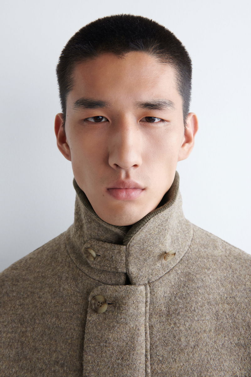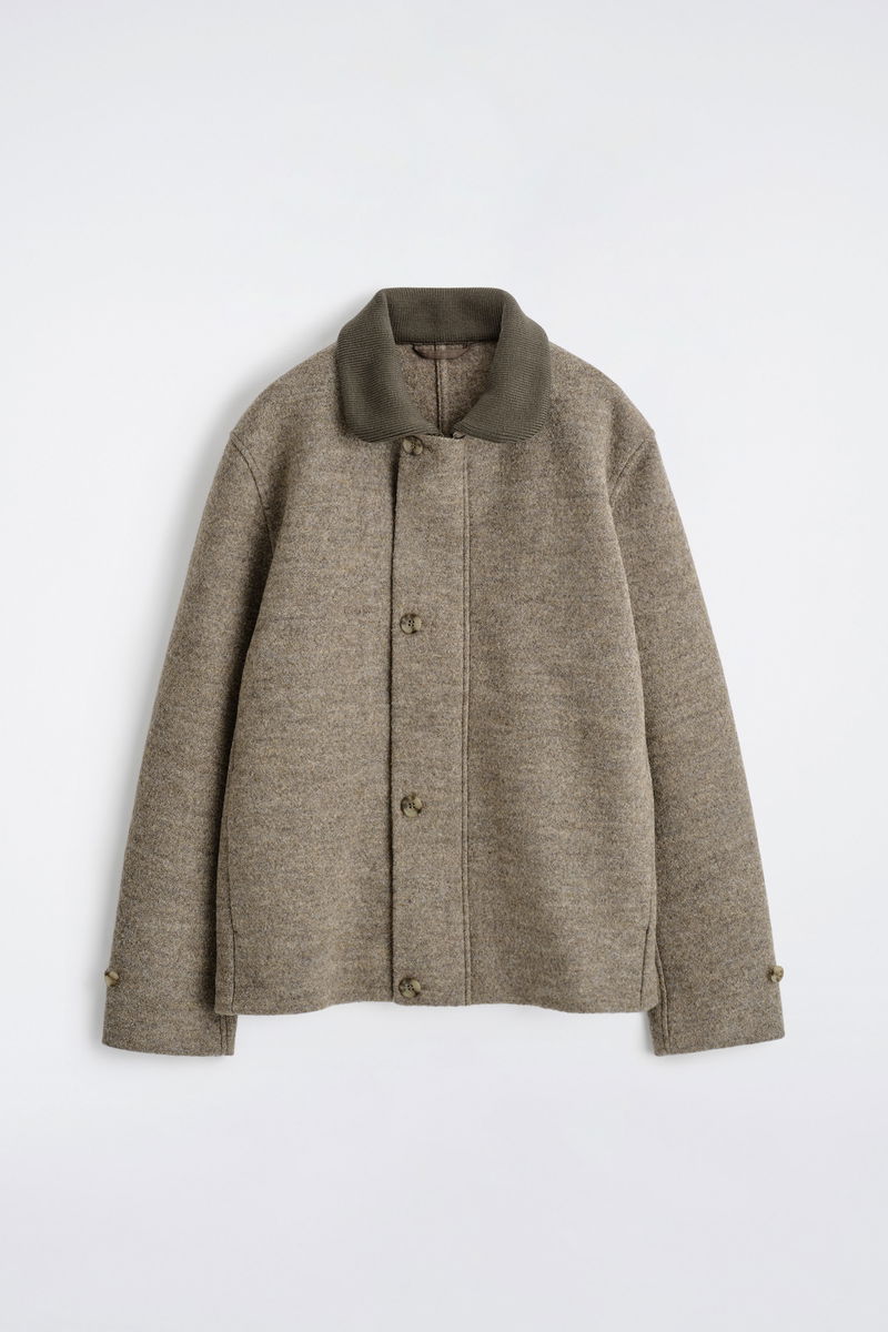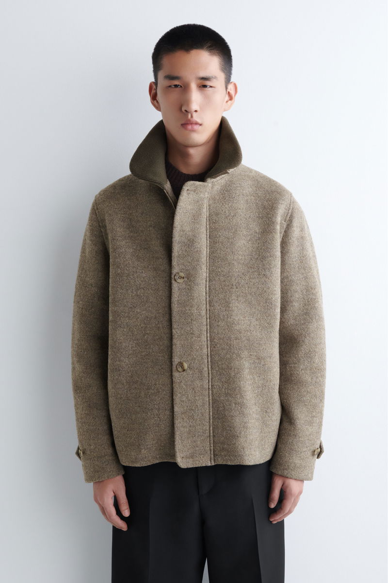 The boiled-wool jacket is a signature of the COS wardrobe. This modern piece is crafted from premium RWS wool and accented with a subtly contrasting ribbed-knit collar. It's cut in a relaxed shape and features buttoned cuffs and subtle side pockets.