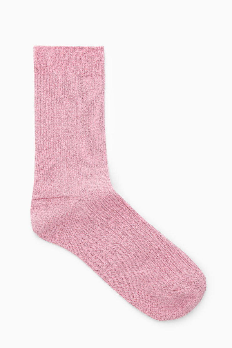 These statement pink socks are made from an organic cotton blend with a touch of stretch for comfort. The metallised fibres create a subtle shine that adds a point of interest to an otherwise minimal outfit.