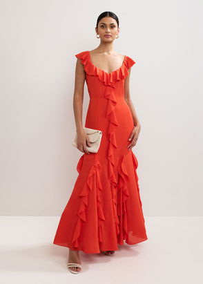 Crafted from a sustainably sourced TENCELTM blend, this orange lightweight maxi dress is cut for an A-line silhouette and is designed to fall loosely over the body. It features a deep back pleat and asymmetric hem for added movement as well as draped ruffles along the neckline, creating delicate cap sleeves