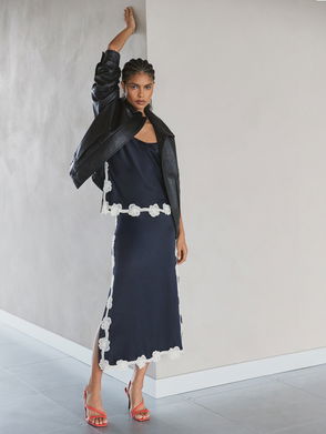 Crafted from luxuriously soft satin, this refined cami top is striking in its simplicity. It's designed with a laser-cut V-neckline, slim shoulder straps and delicate bias-cut chiffon trims. Style it with the matching skirt for a tonal look.