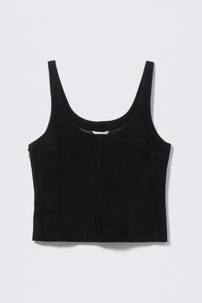 Balancing structure and softness, this refined tank top is crafted from subtly brushed suede in a rich anthracite hue and cut with a scooped neckline that mirrors the curved hem. Style it with the matching shorts for an impactful look with a modern ease.
