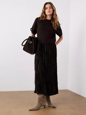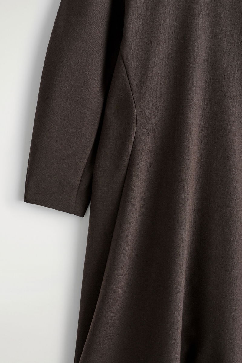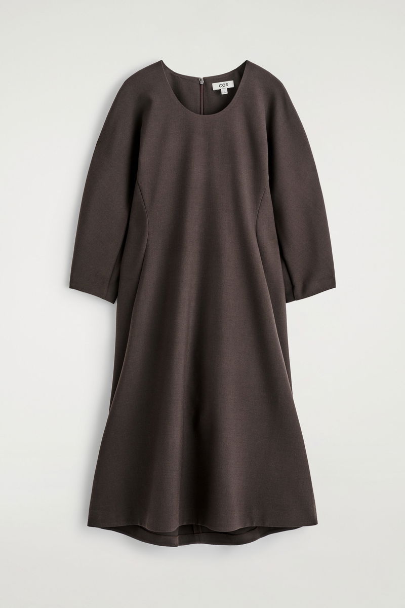 This season, sculpted silhouettes bring a new mood to the classic midi dress. Rendered in a bitter chocolate tone, this refined piece is made from an ECOVERO™ Viscose blend and features a scooped neckline, long sleeves and discreet seams that contour the waist.