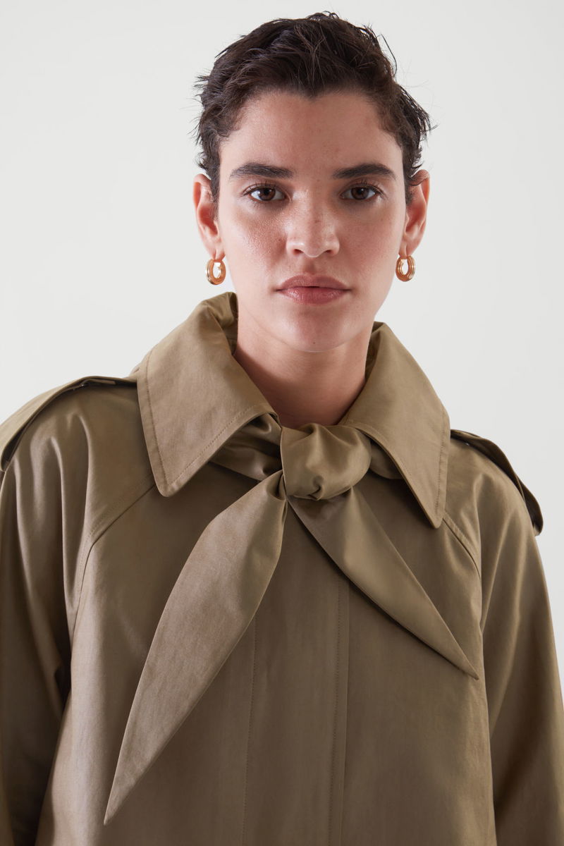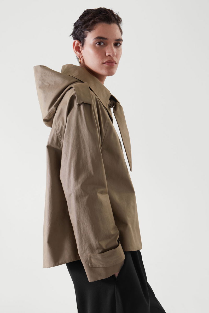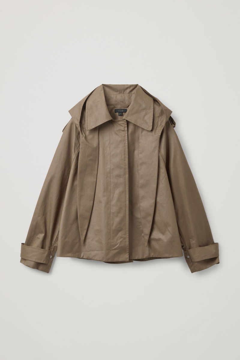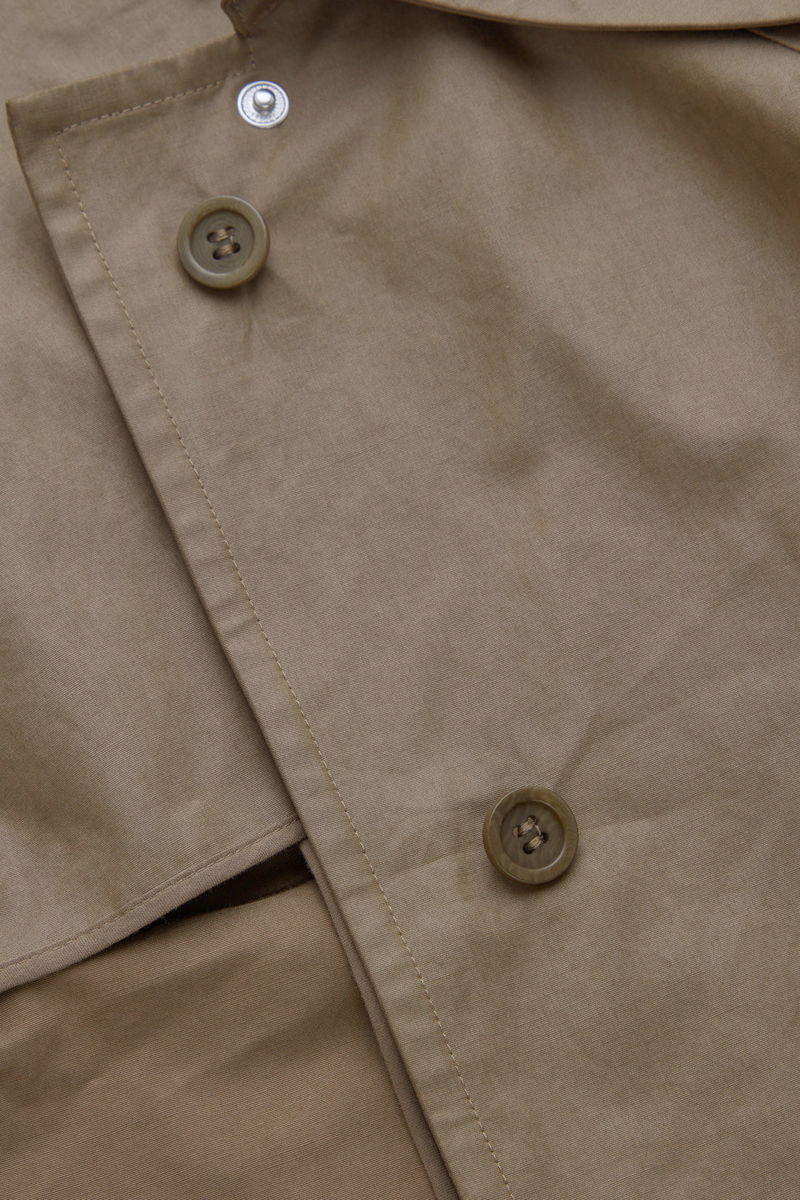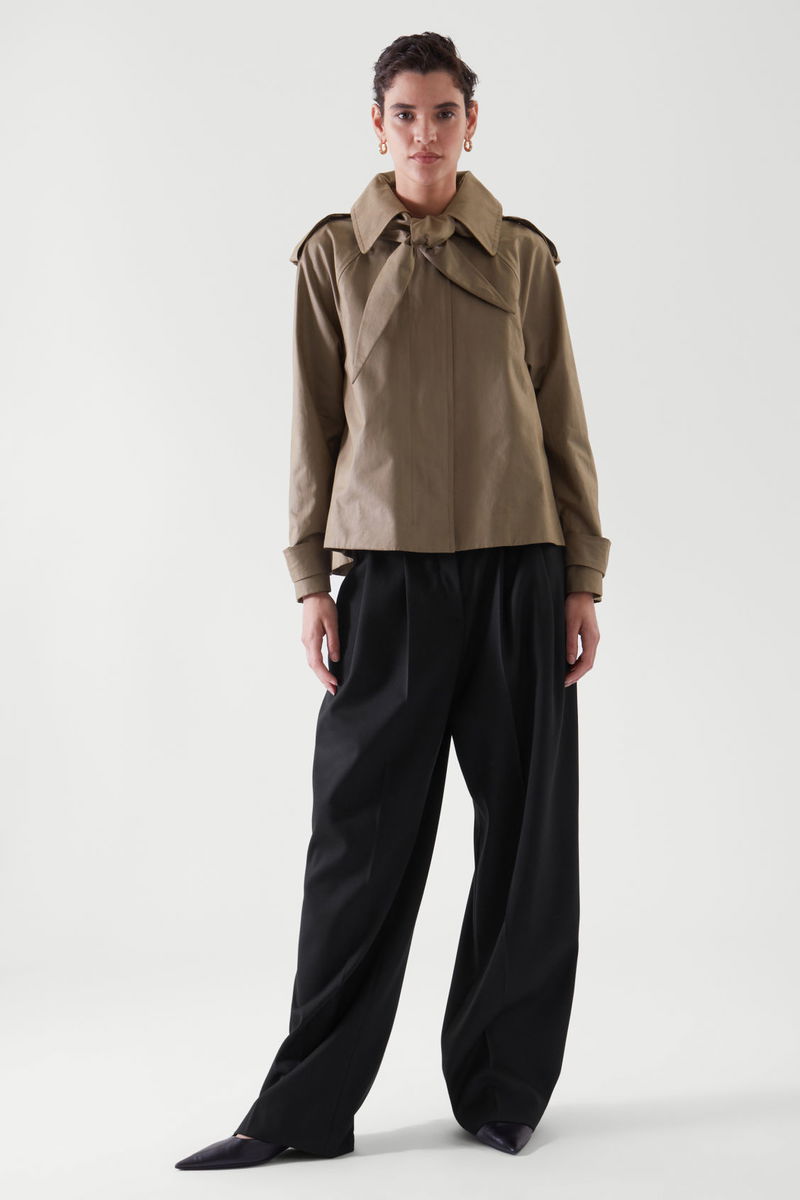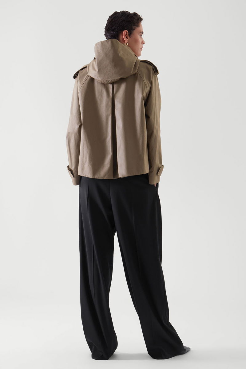With trench inspired details, this short jacket offers a lightweight layer. Details include relaxed raglan sleeves, topstitched seams, side pockets, and a back pleat, for a relaxed fit.