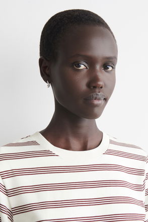Patterned with classic narrow stripes, this top is made from comfortable cotton jersey with a soft quality. Flaring slightly towards the hemline for an A-line fit, it has 3⁄4 sleeves, a round neck and a curved hem.