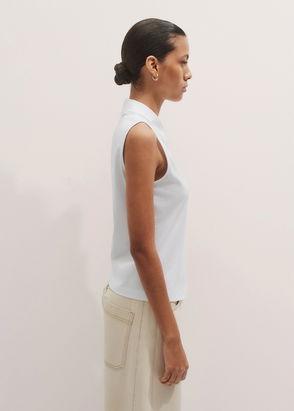 A breathable take on tailoring. Made from organic cotton, this sleeveless shirt has a clean collar with high curved slits. A functional insert that lets you play with textures and proportions.