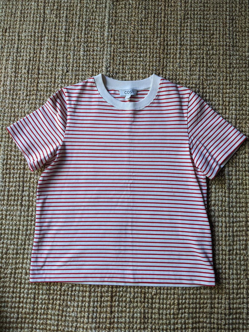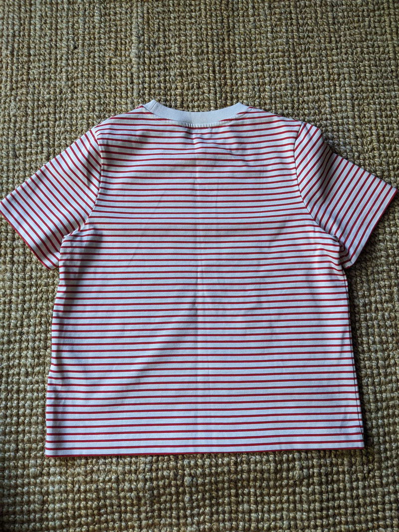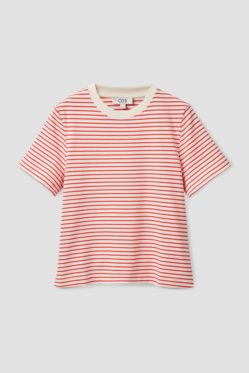 The classic T-shirt gets a bold update in a red striped motif. Crafted from super-soft organic cotton, it’s cut for a loose fit and finished with a contrast collar for a contemporary finish.