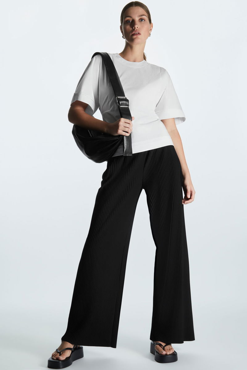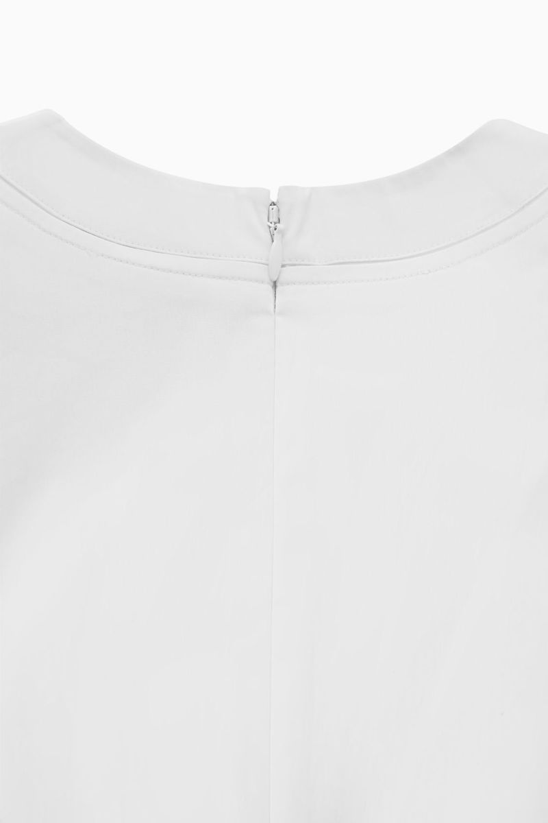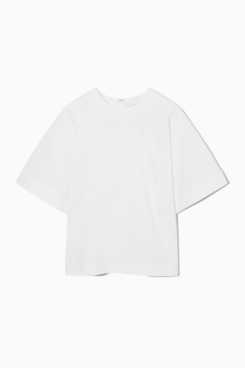 Crafted from a structured cotton blend with a touch of stretch, this modern T-shirt is cut for a slim fit in the body and nipped in at the back for a more defined silhouette. It's offset with wide, relaxed sleeves and has tonal topstitching at the cuffs and hem.