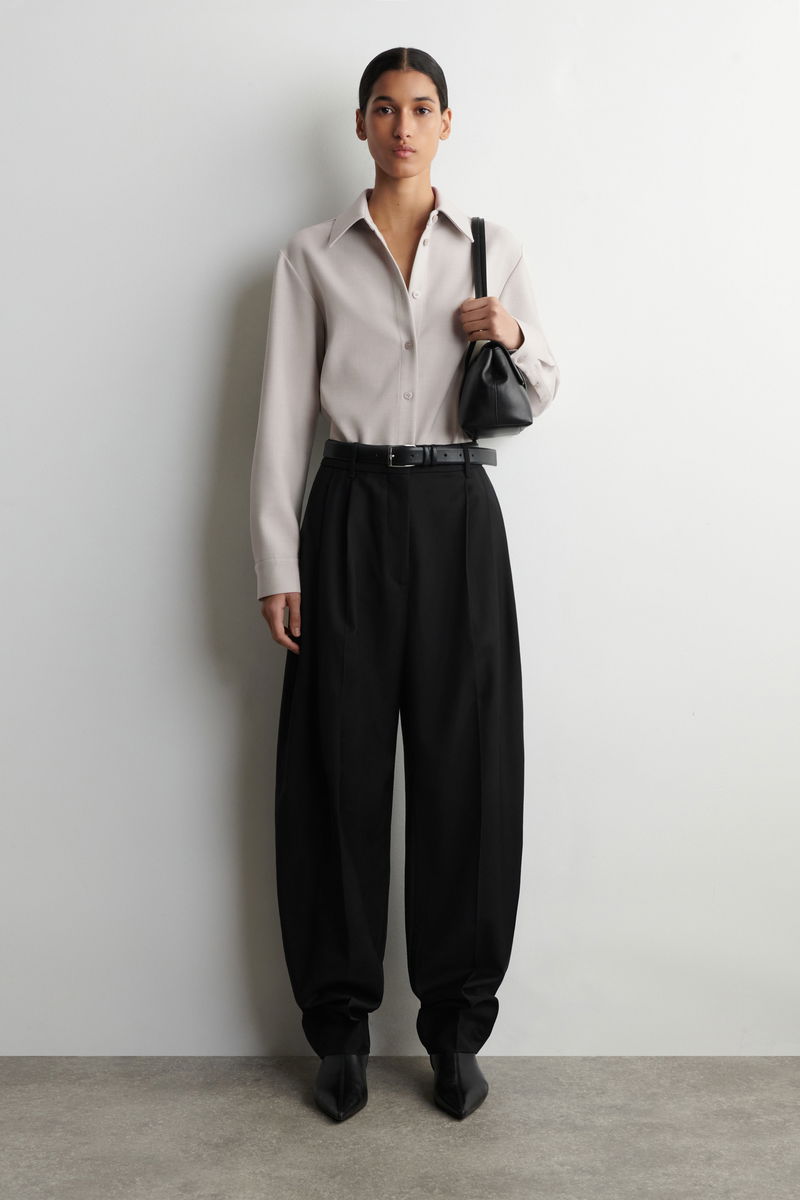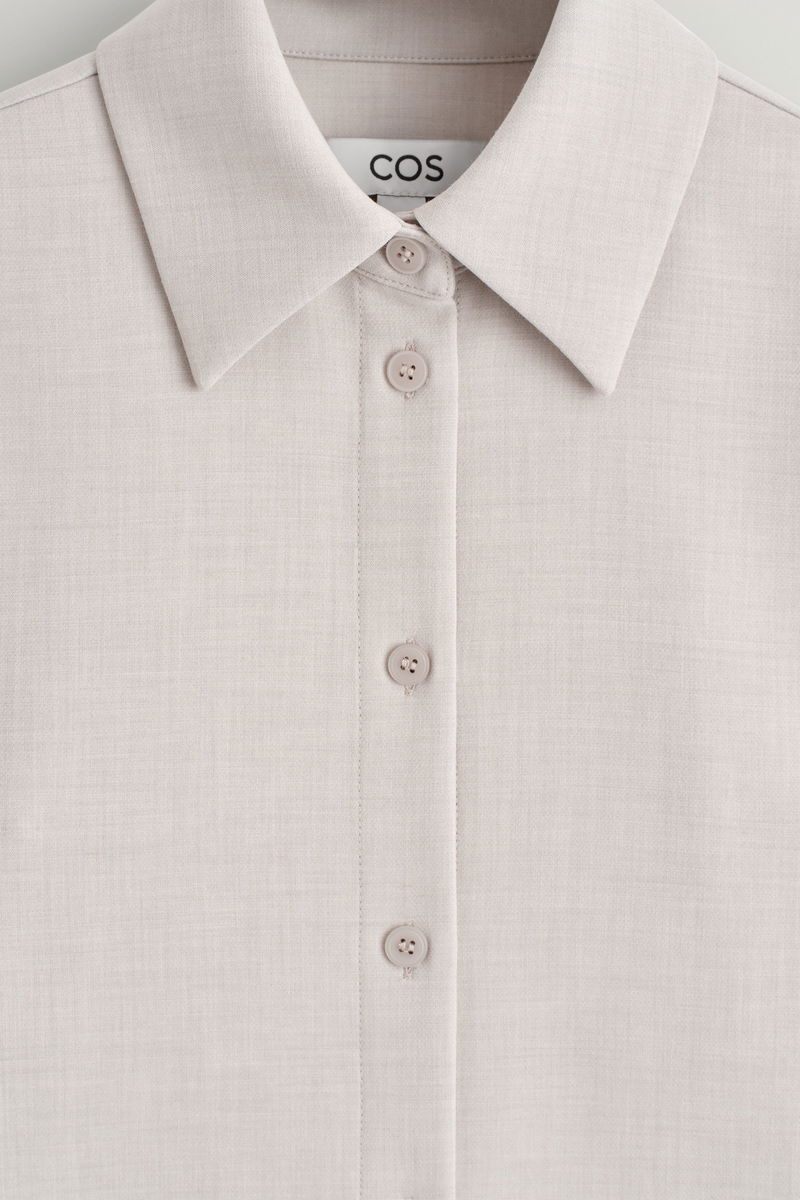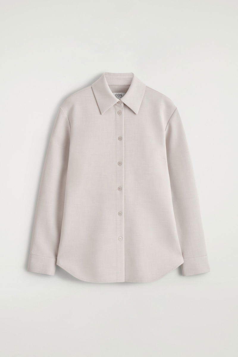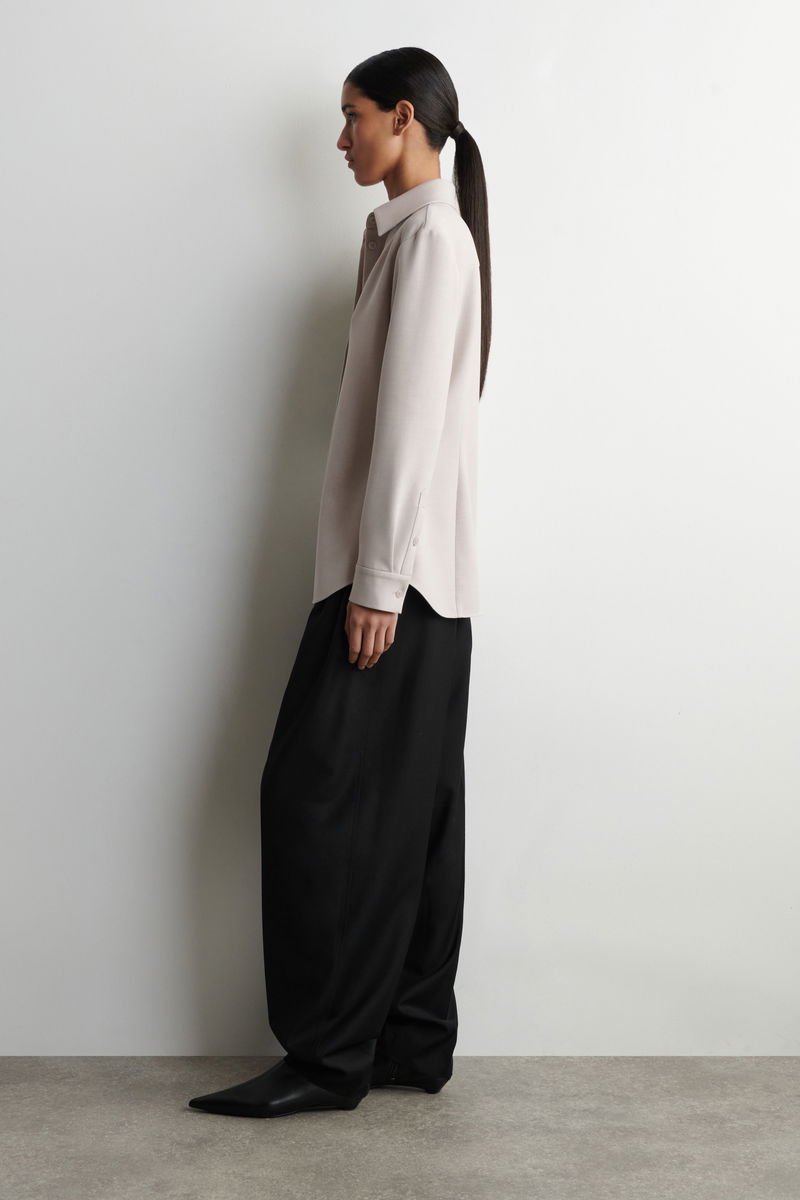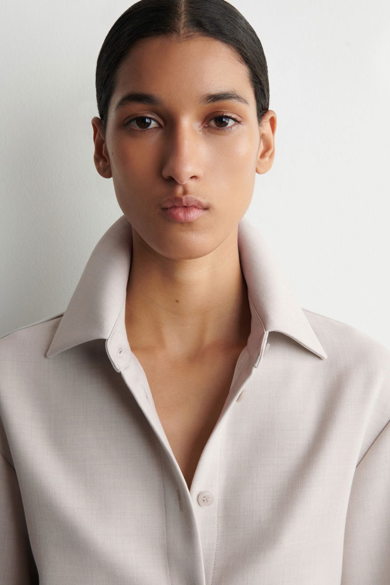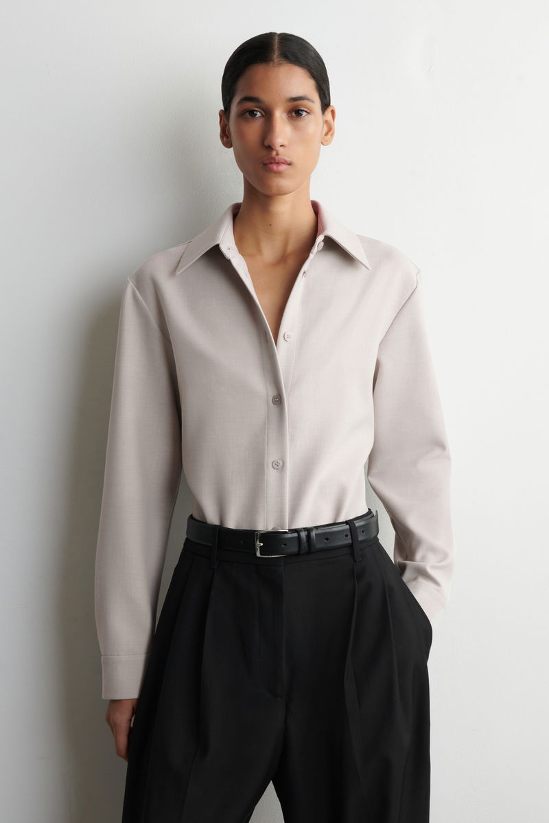 Rendered in a versatile pale-grey tone, this shirt is cut in a slim, sculpted shape with a darted waist that softens the silhouette. The pointed collar, buttoned cuffs and rounded hem nod to classic tailoring codes.