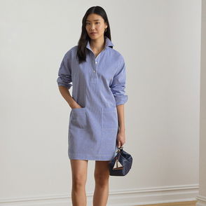 The Summer 2025 collection spotlights classic silhouettes with modern appeal. Patterned with diffused stripes, this short-sleeved shirt dress has an open collar and is crafted from naturally light cotton and linen. Style it with leather sandals for an effortless look.