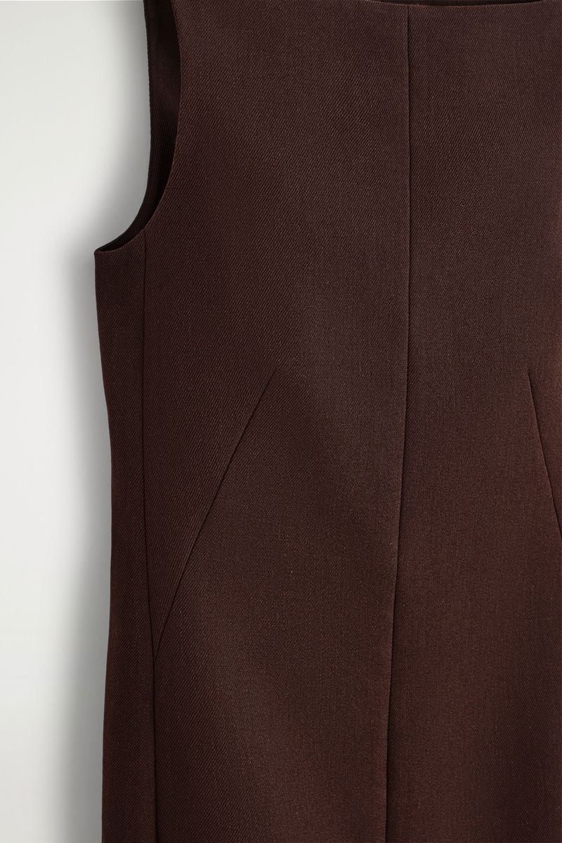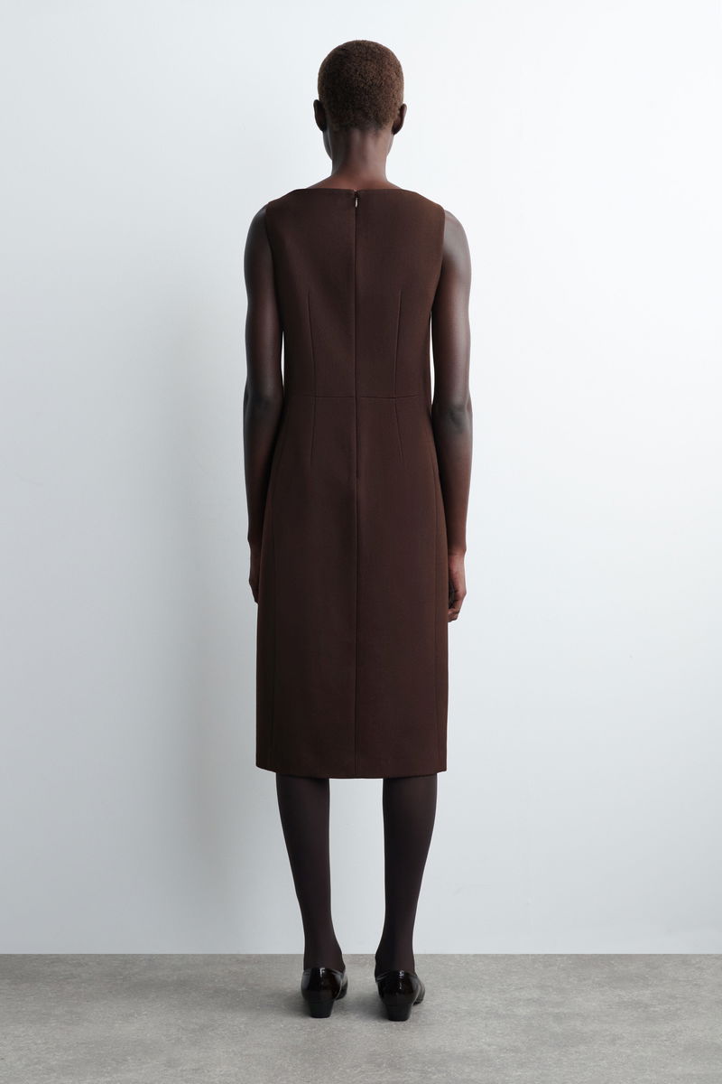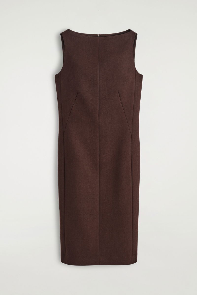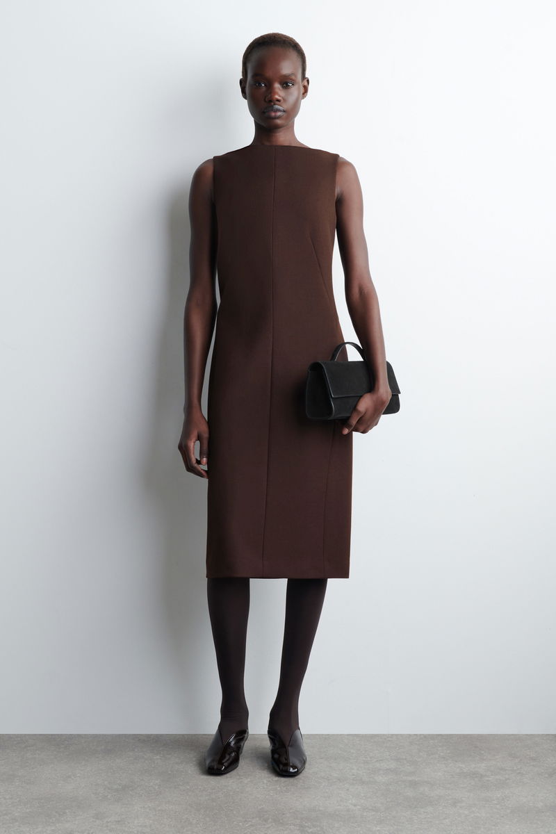 This modern midi dress is cut in a sculpted shape with darts at the waist for a contoured silhouette. It's crafted from wool-blend twill and designed with a high, straight neckline that's reminscent of '90s tailoring.