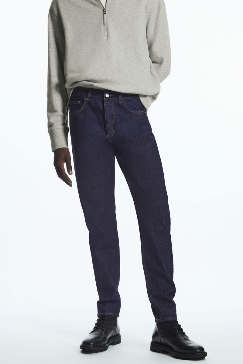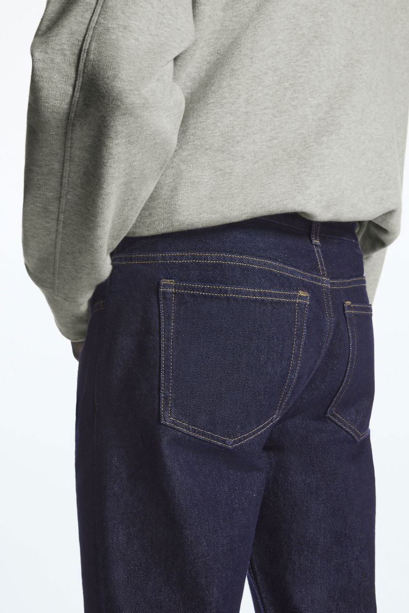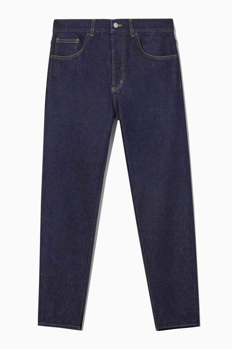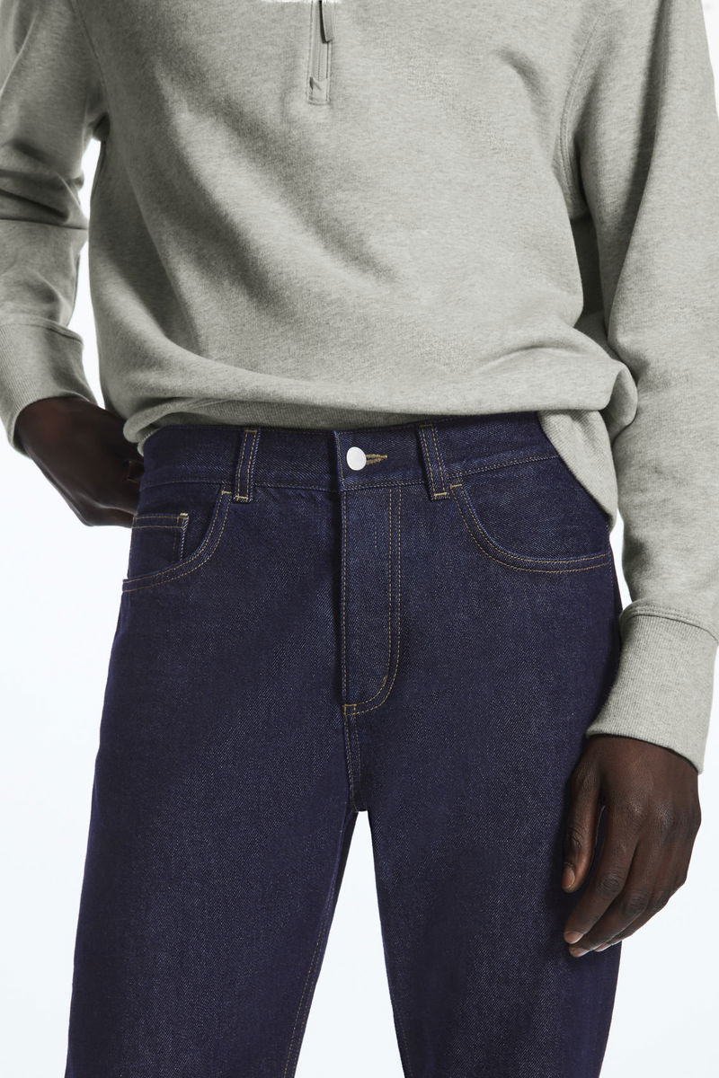 Sustainably crafted from non-stretch recycled cotton and made without metal rivets for easy recycling. A mid-rise fit that sits just below the waist, these indigo blue, classic-cut jeans fit neatly and gently taper towards the ankle.