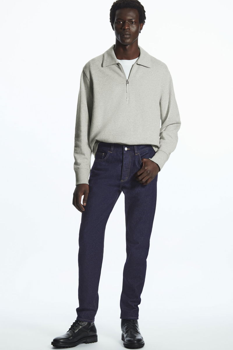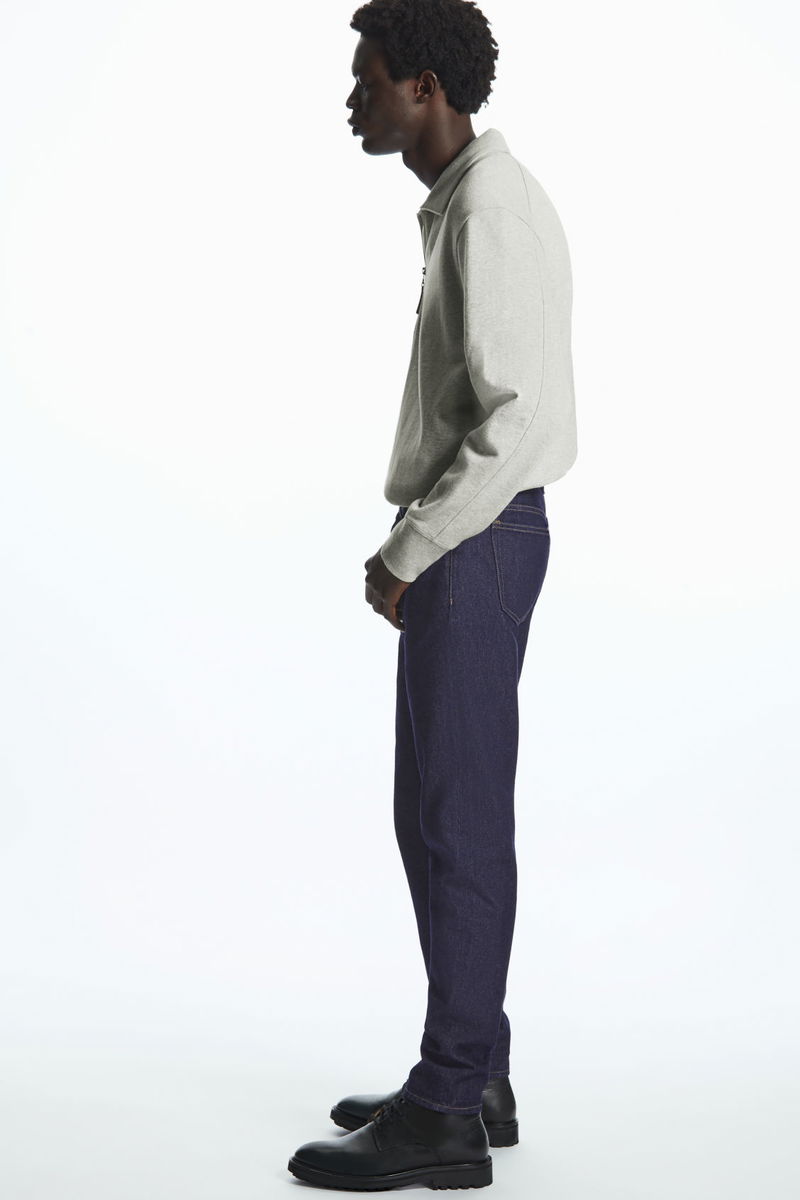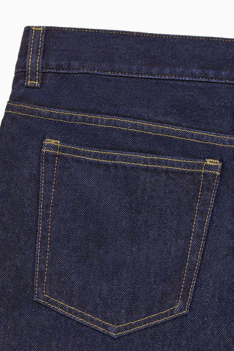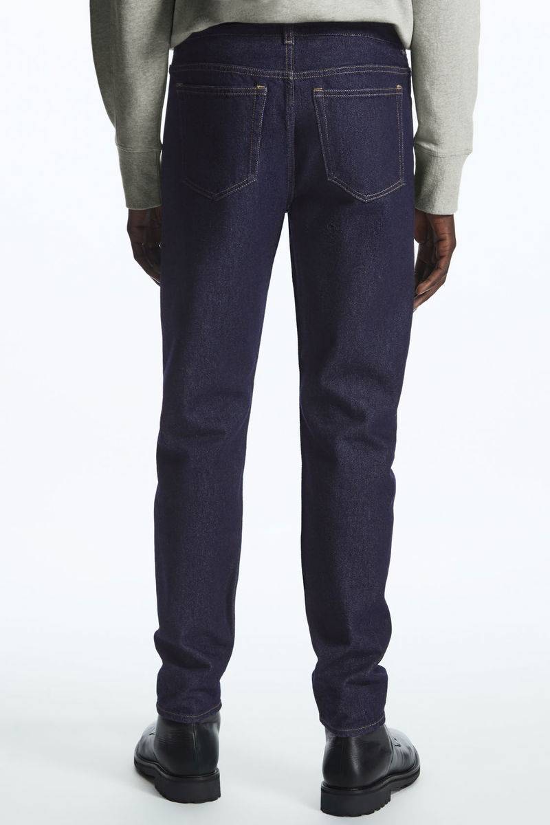Sustainably crafted from non-stretch recycled cotton and made without metal rivets for easy recycling. A mid-rise fit that sits just below the waist, these indigo blue, classic-cut jeans fit neatly and gently taper towards the ankle.